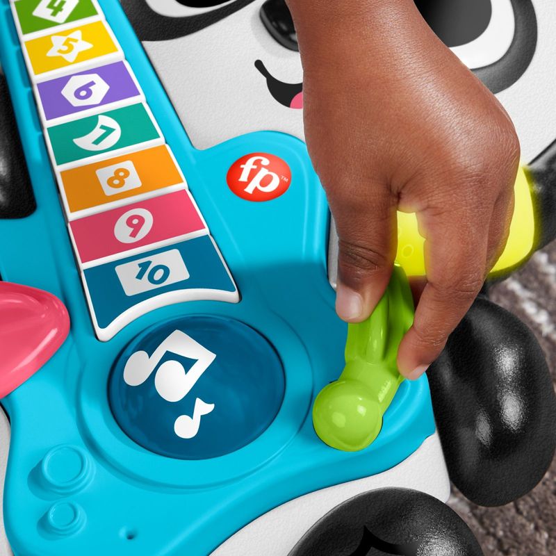Panda Vamos Contar Juntos c/ Som e Luz Marca: Fisher-Price - Mattel Idade Recomendada: Maiores de 9 meses. Bebês e crianças pequenas podem contar com a diversão do brinquedo musical Esquadrão Musical Panda Vamos Contar Juntos da Fisher-Price. Quando as crianças pressionam os 10 botões coloridos da guitarra ou giram a bola de rolamento, o microfone do Panda se ilumina para sincronizar a batida com músicas, sons e frases sobre contagem e muito mais. As crianças podem usar a incrível barra de som para reproduzir efeitos sonoros de guitarra e usar o clique "pick" para uma brincadeira sensorial adicional.