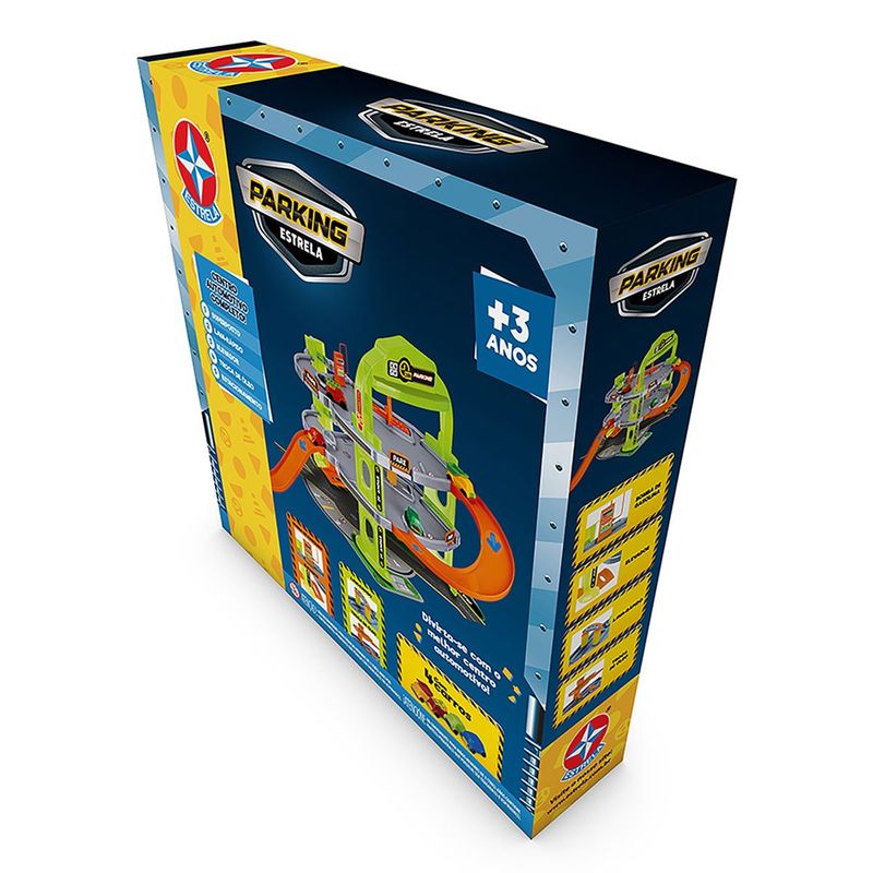 O Parking Estrela é um estacionamento de 3 andares com diversos detalhes e uma cartela de adesivos para personalização. Contendo rampas de acesso, elevador para carros, bomba de combustivel entre outras funções a criança pode se divertir desde a montagem do estacionamento até o uso dele. Com carros roda livre ela pode dirigir pelo estacionamento e se divertir por horas, treinando suas habilidades motoras e também explorando a criatividade com as diversas possibilidades do Parking Estrela.