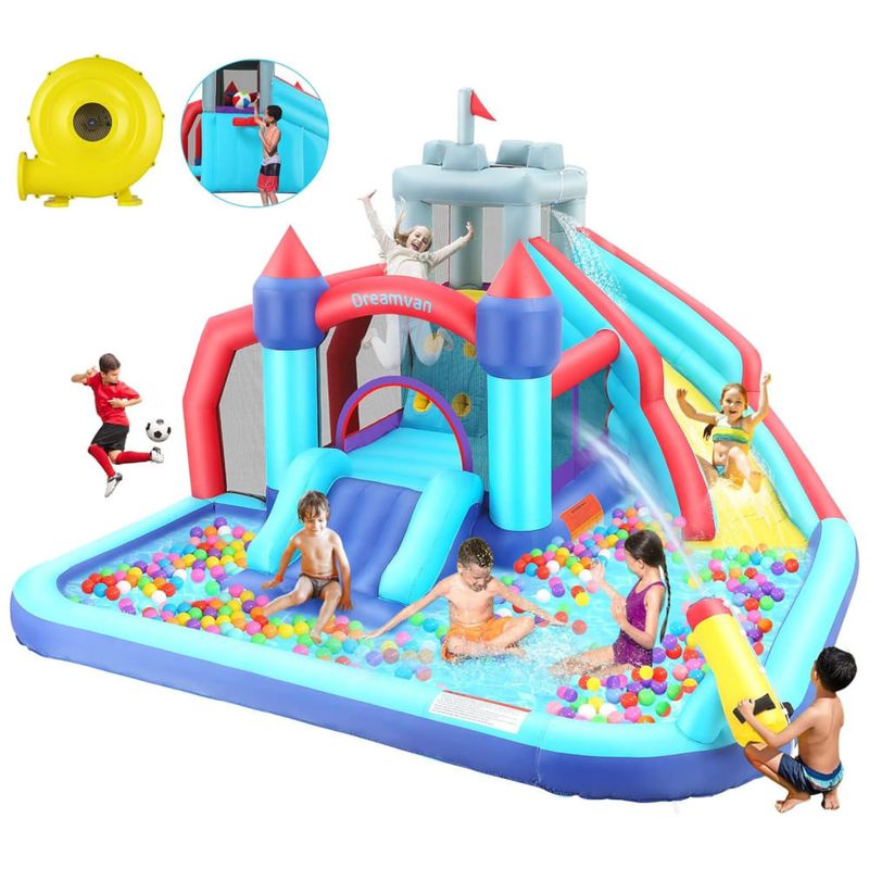 Ele também é portátil e adequado para ambientes externos e internos, podendo ser utilizado em festas de aniversário, quintais, parques, reuniões familiares e mais lugares. Pode acomodar até 34 crianças de 3 a 10 anos por vez, desde que o peso de cada criança não ultrapasse 45,35 quilos. Acompanha 2 x bolas infláveis, 1 x kit de montagem de mangueira, 6 x bouncer, 4 x estacas de soprador, 24 x remendos de reparo e 4 rolos de fio de reparo para fácil manutenção.