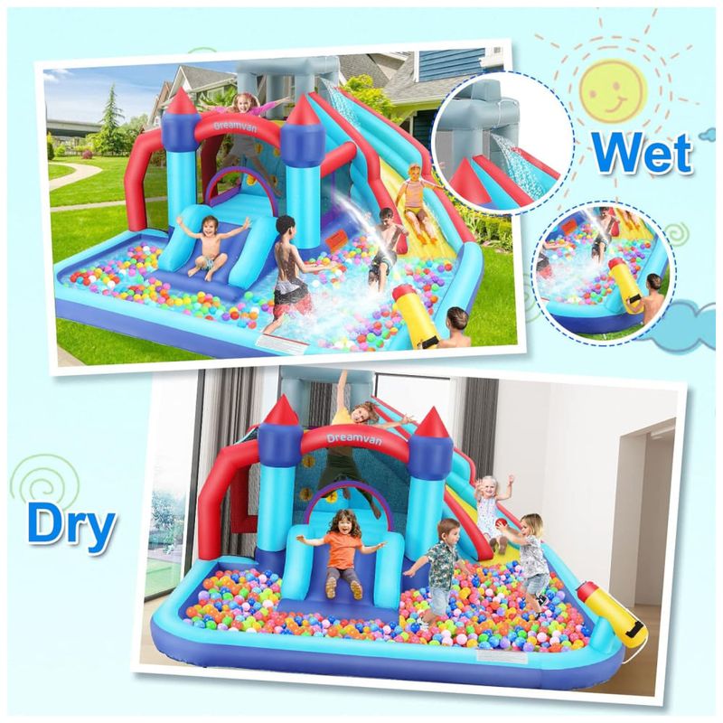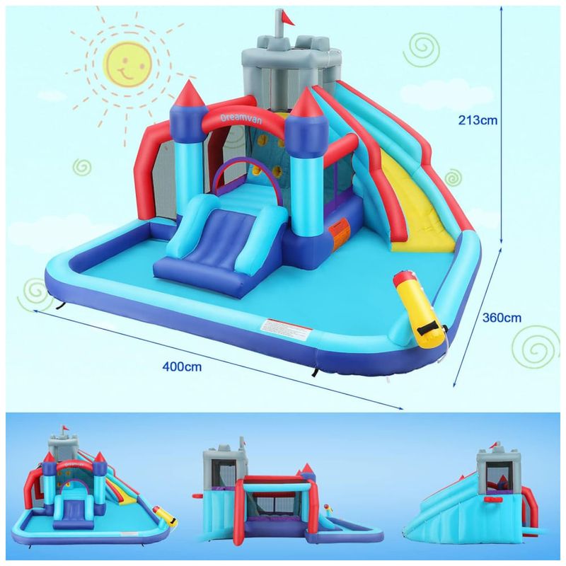 Este toboágua inflável é o que faltava para as crianças se divertirem Com 2 escorregadores, parede de escalada, cesta de basquete, piscina infantil, canhão, área de salto e portão de bola, as possibilidades de entretenimento são infinitas. O castelo inflável é feito de 840D Tecido Oxford 420D Oxford, resistente ao desgaste e ao rasgo, reforçado por costuras duplas e kits de remendos para durar mais tempo.