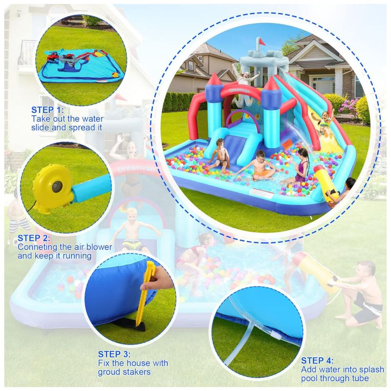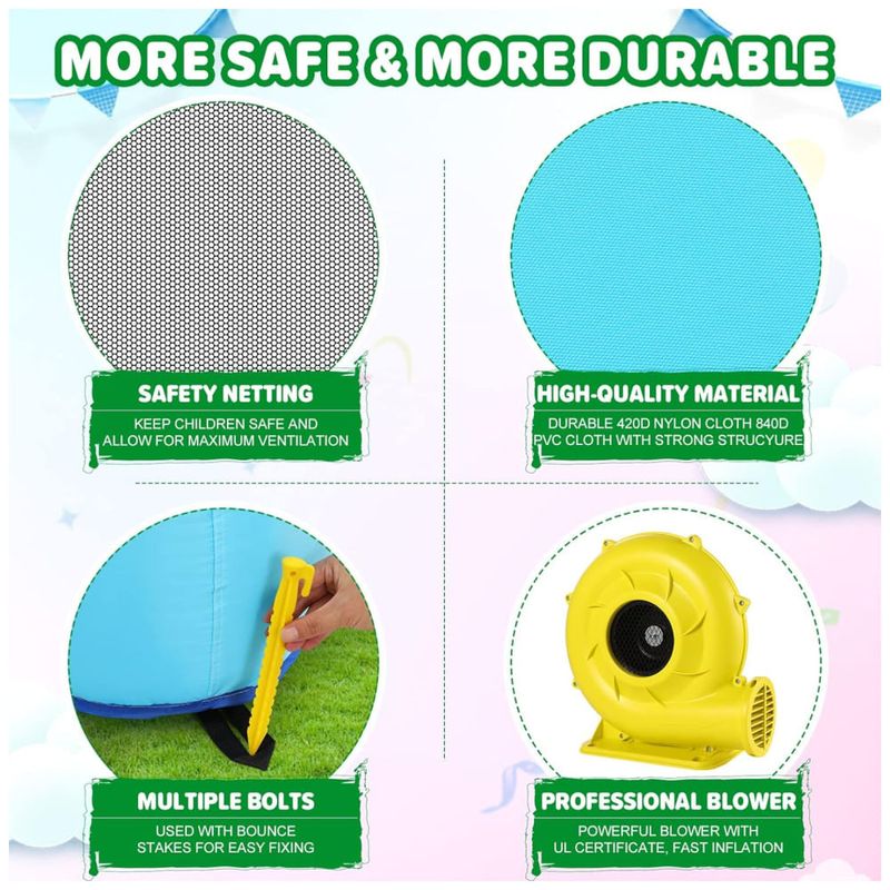 A área de salto, o portão de bola e o topo do escorregador são cercados por paredes de malha para garantir a segurança das crianças enquanto brincam e permitir a máxima ventilação. As estacas incluídas adicionam mais estabilidade ao castelo. Este bouncer inflável vem com um poderoso soprador de ar de 580 W incluído que permite a configuração e desmontagem em minutos.