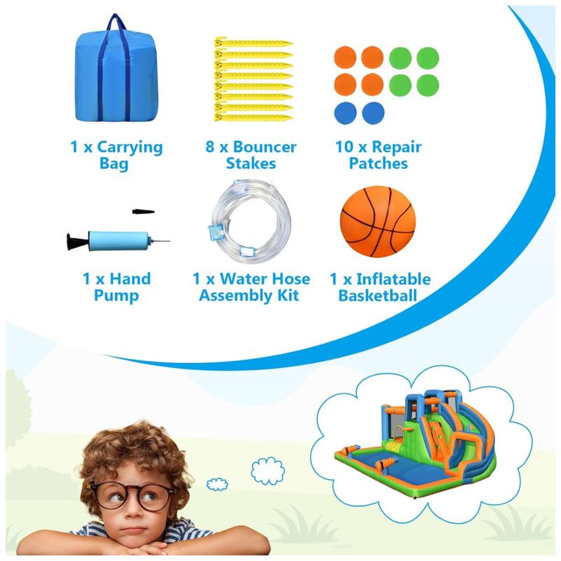 O pacote com tudo incluído vem com uma bolsa de transporte conveniente, estacas de segurança, remendos de reparo, kit de montagem de mangueira de água, bola de basquete inflável e bomba manual para a bola. Recomendado para uso com soprador 735W750W não incluído .