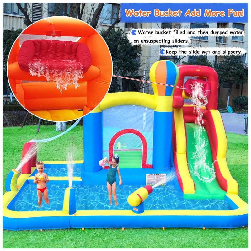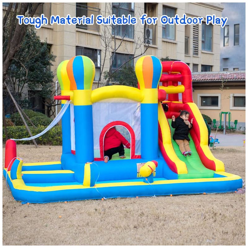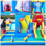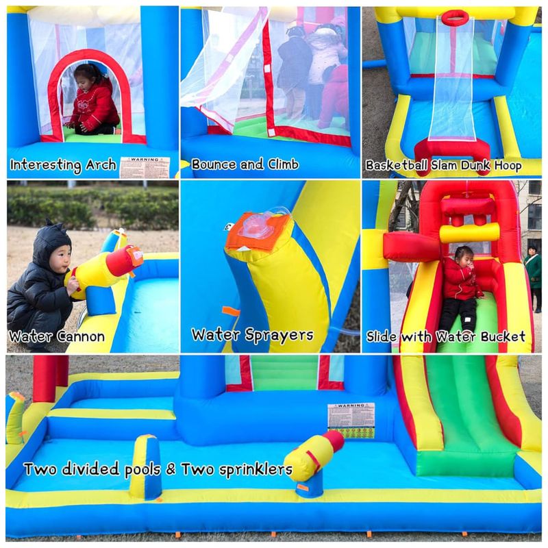 Além disso, é seguro para as crianças, em conformidade com ASTM F96317. Acompanha um soprador, remendo de reparo, instruções, estacas de gramado e uma bolsa de transporte. A inflação leva menos de 2 minutos e a remoção é fácil. É adequada para festas internas e externas, com vários espaços de lazer interligados.
