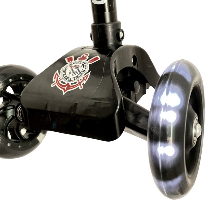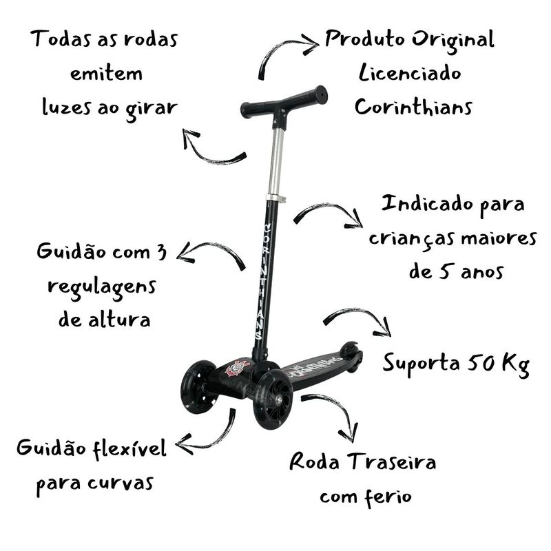 O Patinete Infantil com 3 Rodas e Luz Led Corinthians deixará os baixinhos de todas as idades felizes! As rodas emitem luz ao girar, guidão flexível para curvas, haste do guidão dobrável, guidão com 4 regulagens de altura, roda traseira com freio, suporta até 50 quilos, sendo um produto licenciado original do time paulista Corinthians.