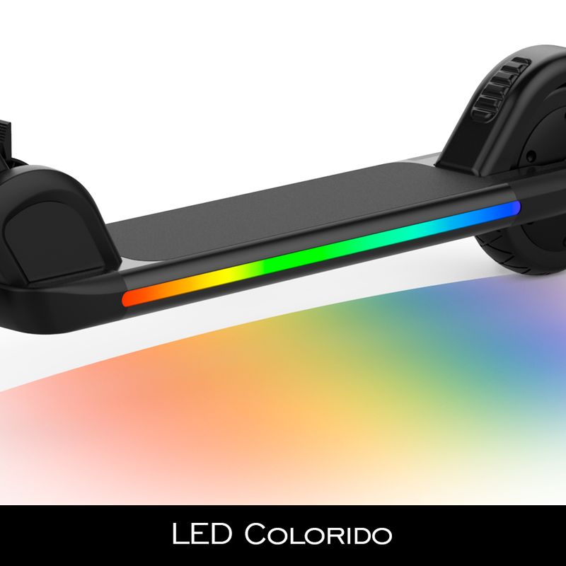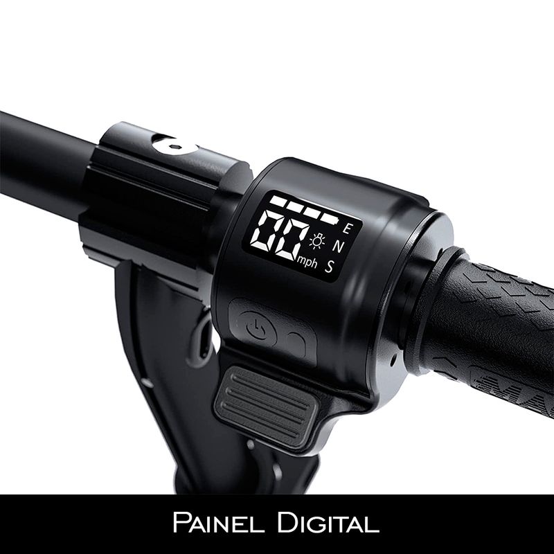 DESTAQUES EXCLUSIVOS:–Motor: 24v,150w–Vel Máx: 15 km/h–Bateria: Lítio 24v, 2.25ah–Autonomia: 08 km–Tempo de Recarga: 03-04 hs–Carga Máx: 60 kg–Roda: 6.0” maciça–LED Ambiente, Painel LCD, 03 Velocidades, Dobrável