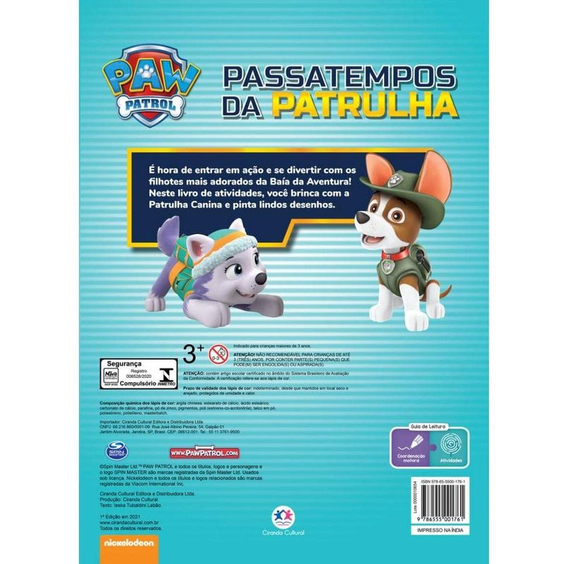 Patrulha Canina Passatempos da Patrulha - Ciranda Cultural É hora de entrar em ação e se divertir com os filhotes mais adorados da atualidade! Neste livro de atividades, você brinca com a Patrulha Canina e pinta lindos desenhos! Idade recomendada: a partir de 3 anos de idade. Selo INMETRO: 006528/2020.