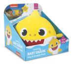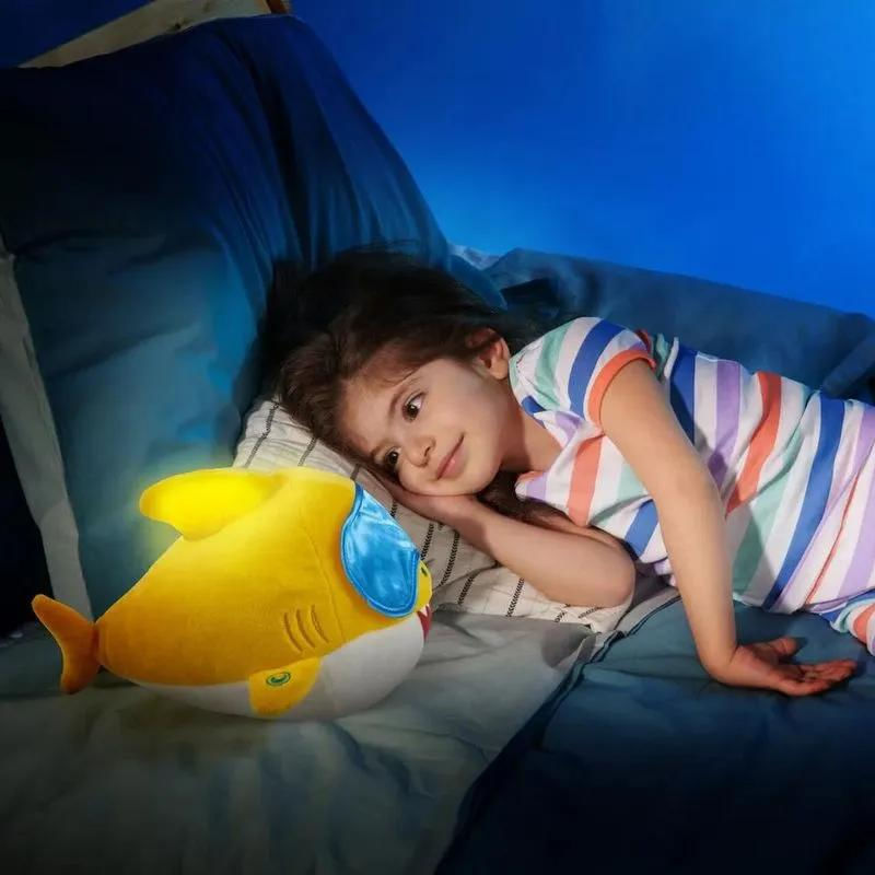 Aviso: Imagens meramente ilustrativas!! Baby Shark Hora De Dormir! Divirta-se durante o dia ou durma tranquilamente com sua pelúcia favorita! A pelúcia possui dois modos - Modo Dia: cante a música tema do desenho. Modo Noturno: apague as luzes ou cubra os olhos do Baby Shark com a máscara de dormir para ele cantar a canção de ninar Goodnight Baby Shark. A barbatana superior do Baby Shark se ilumina com um suave brilho noturno! \n\nIdade recomendada:2-4 anos;Composição/Material:Pelúcia;Funciona com pilhas:Sim;Brinquedo com luz:Sim;Brinquedo com som:Sim;Dimensões:18,7x21x19 cm;Peso:0,351 kg;Código de Barras:7899573623586;Garantia do Fornecedor:3 Meses contra defeito de fabricação;
