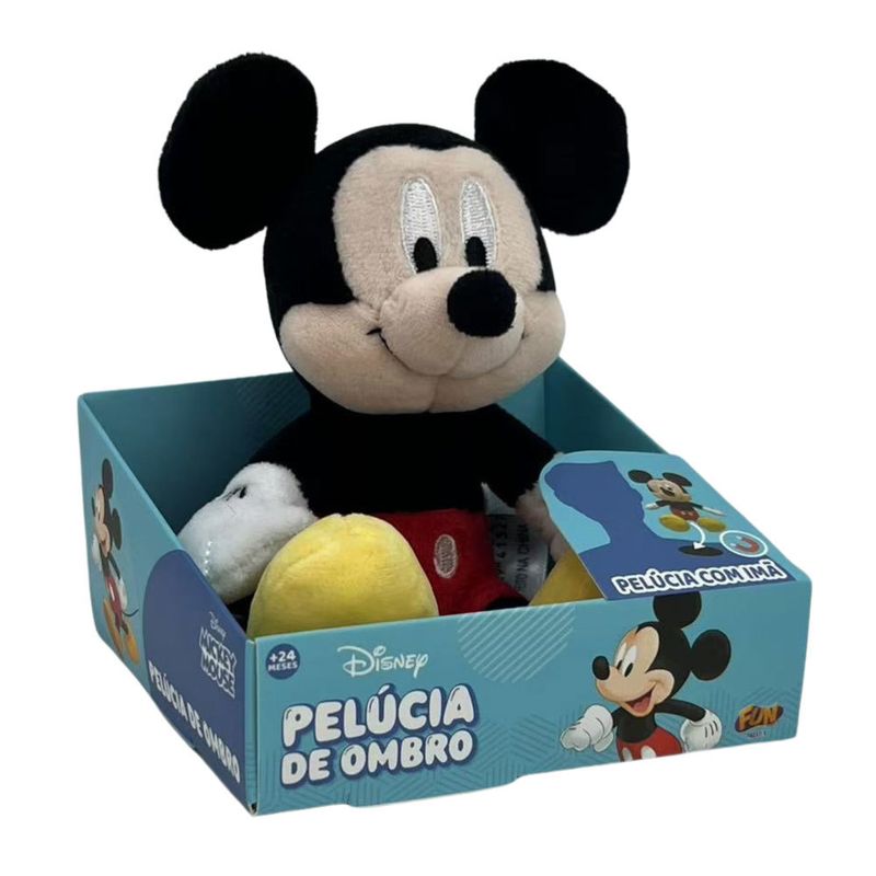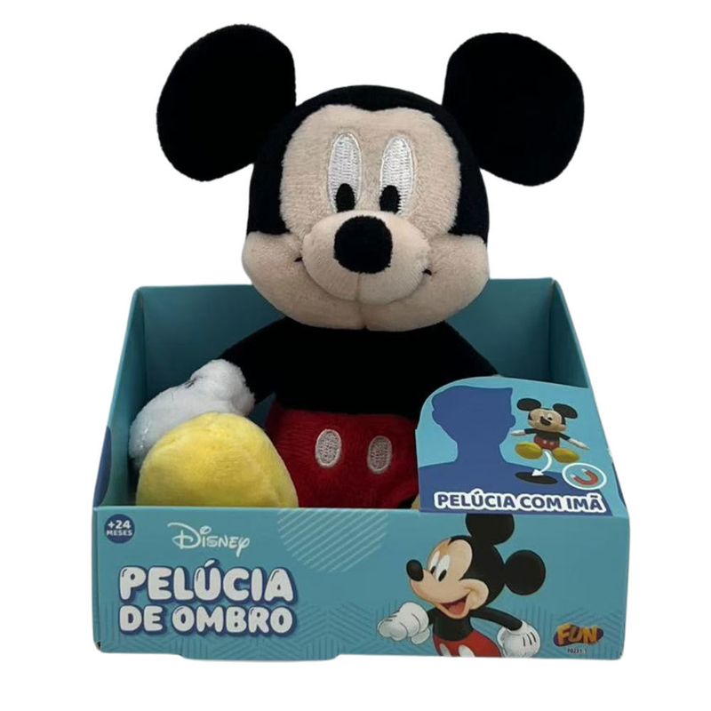 A pelúcia vem com uma base magnética discreta, que se encaixa sob a roupa e permite que o Mickey fique firmemente apoiado no ombro, sem cair ou incomodar. Um item divertido, colecionável e perfeito para presentear.