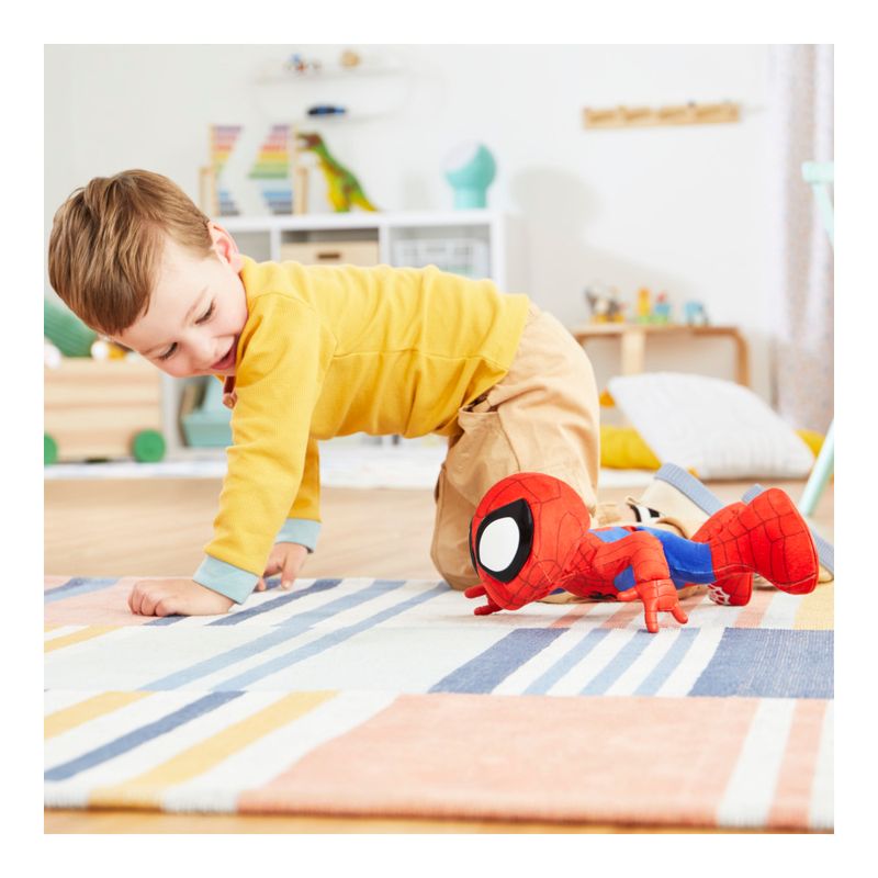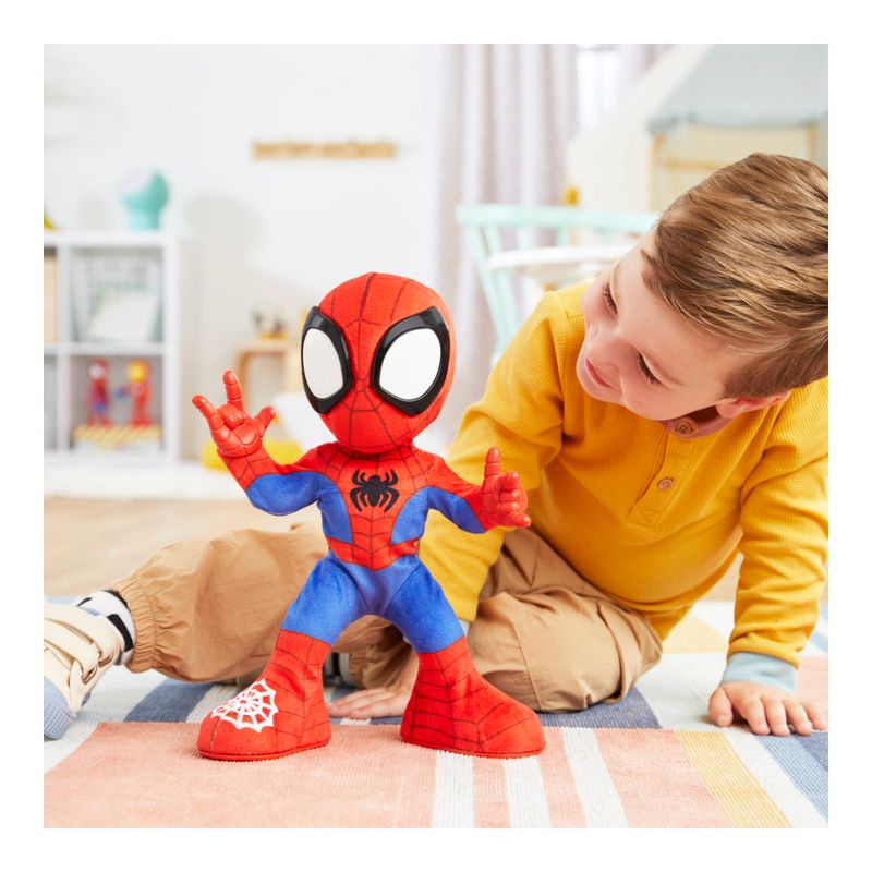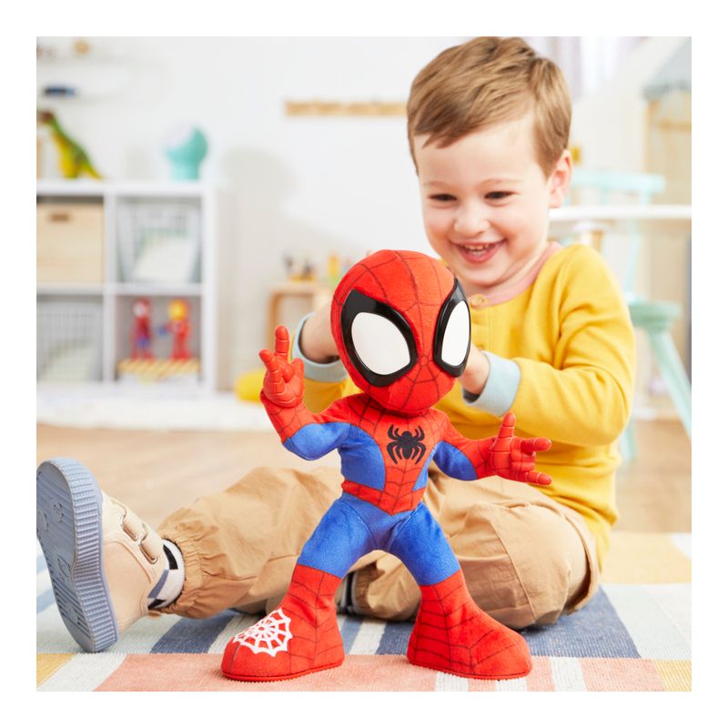 "BRINCAR E DANÇAR COM O ARANHA: A brinquedo de pelúcia Dance 'N Crawl Spidey é interativo com frases, sons e canções do desenho animado da Disney Junior. As crianças vão dançar, sorrir, cantar e brincar com o Aranha