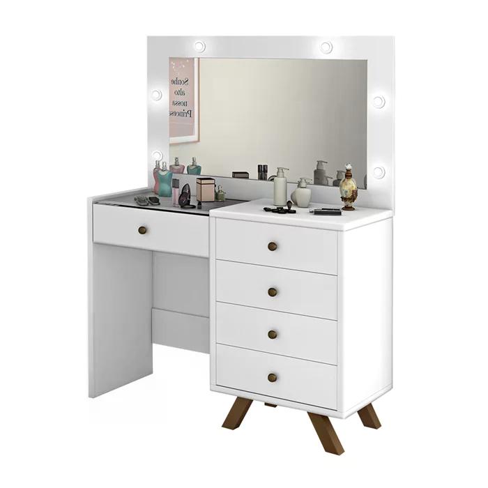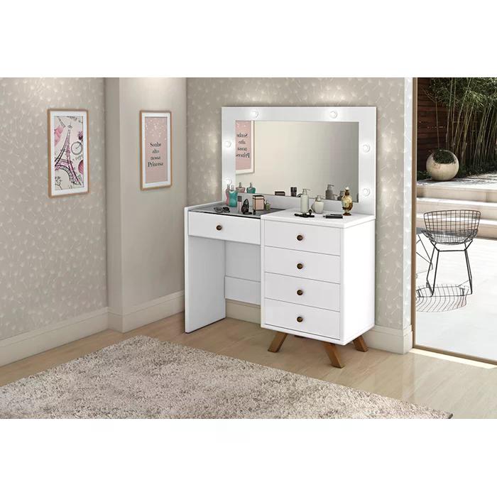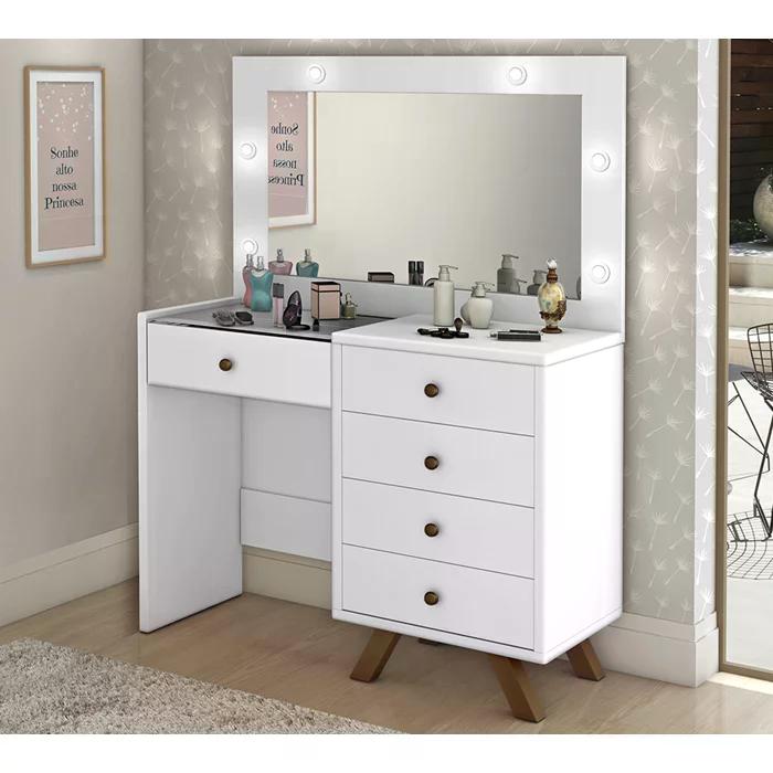 A Penteadeira Luna, trata-se de um produto com destaques versáteis, que proporciona um estilo ideal para se preparar para as ocasiões mais especiais, unindo design moderno e minimalista à utilidade do dia a dia. Estrutura 100% em MDF de 15mm, 18mm e 20mm, contando com pintura em acabamento UV anti risco (Brilho). Composta por 05 gavetas externas com corrediças telescópicas, sendo uma gaveta com divisórias e tampo de vidro, puxadores em metal com acabamento envelhecido, 01 painel fixo com espelho, interruptor, 06 leds, e pés em madeira. Estes móveis chegarão em sua casa separados em 03 volumes.