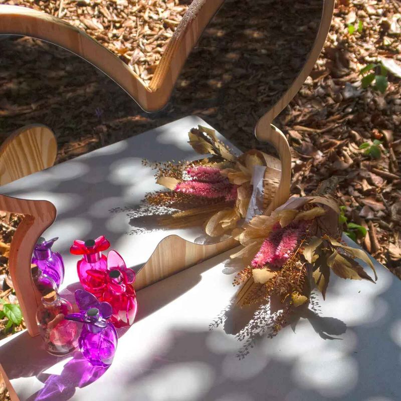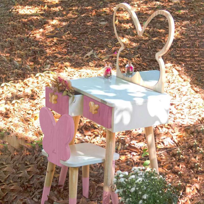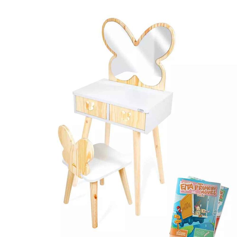 E o melhor de tudo: ela vem acompanhada de uma cadeirinha charmosa, com o encosto no formato de borboleta, completando o conjunto com elegância e praticidade.