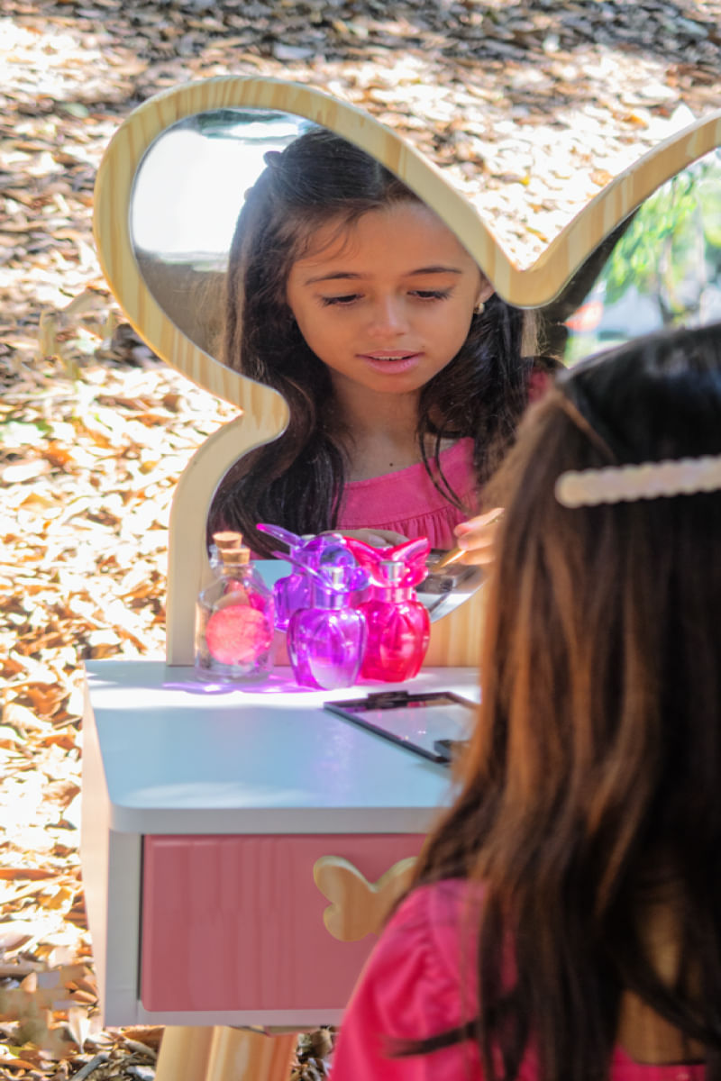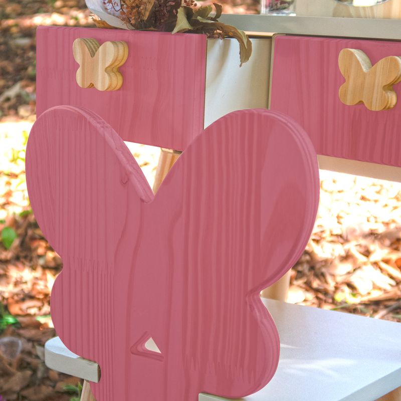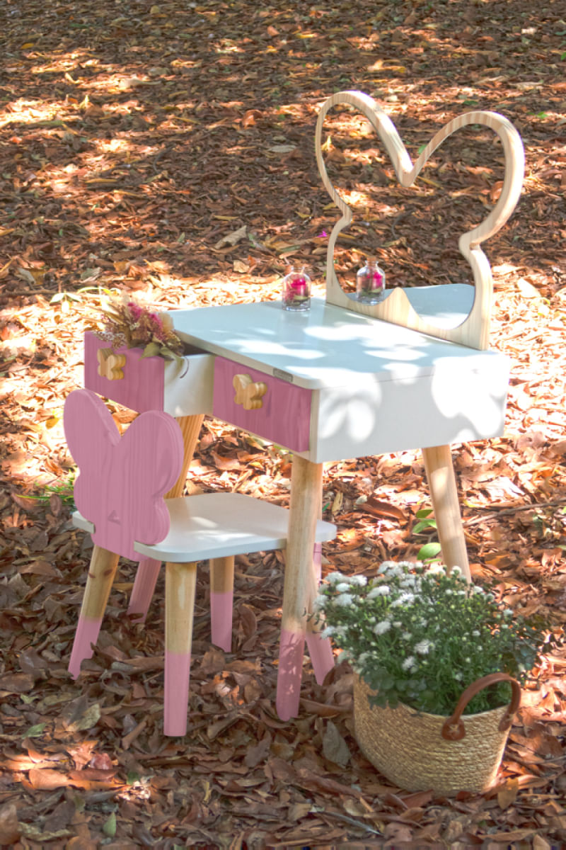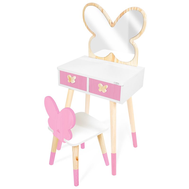 O design encantador adiciona um toque de magia e encanto ao ambiente. Essa Penteadeira Infantil com Cadeirinha e Espelho de Borboleta de tamanho P é recomendada para crianças de 3 a 7 anos.
