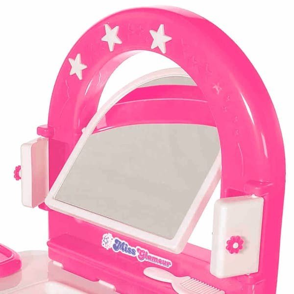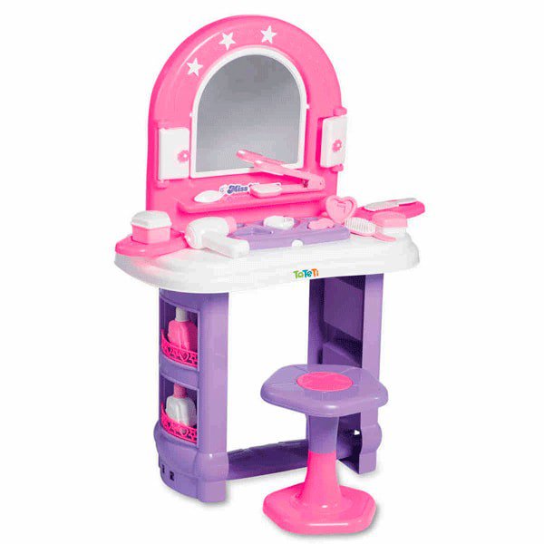 A Miss Glamour conta com vários acessórios para as minis fashionista brincarem de se maquiar. A Penteadeira é mais um brinquedo da marca TaTeTi que é sucesso de vendas, com ótimo acabamento e qualidade ela conta com espelho retrátil com 03 posições, além de porta joias, mini porta retrato e frascos de perfumes para que a produção seja completa.