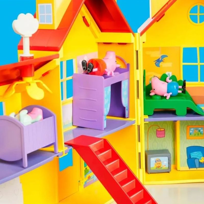 A chegada da irmãzinha da Peppa, Evie, significa que a família Pig está crescendo e a casa deles também! Com o conjunto de brinquedos Peppa's Big Family House, as crianças podem recriar cenas favoritas do desenho e imaginar novas aventuras com Peppa, George e a bebê Evie. Este grande conjunto de brinquedos de 2 andares e 7 cômodos se abre para ter mais de 80 cm de largura e vem com acessórios que as crianças podem usar para decorar e montar a casa como quiserem, incluindo uma cama alta com arco-íris para Peppa, uma cama de dinossauro para George, uma banheira e um sofá! A bebê Evie pode brincar na cadeirinha de balanço, sentar na cadeira alta ou tirar uma soneca de mentirinha no berço. Este conjunto de brinquedos Peppa Pig inclui as figuras da bebê Evie, George e Peppa; procure conjuntos de figuras adicionais inspirados nos personagens favoritos da Peppa Pig (vendidos separadamente, sujeitos à disponibilidade) para aumentar a diversão em família! Brinquedos pré-escolares como Peppa's Big Family House são ótimos presentes para meninas e meninos a partir de 3 anos.