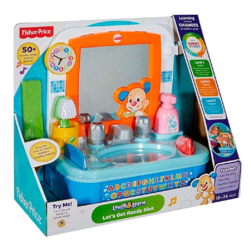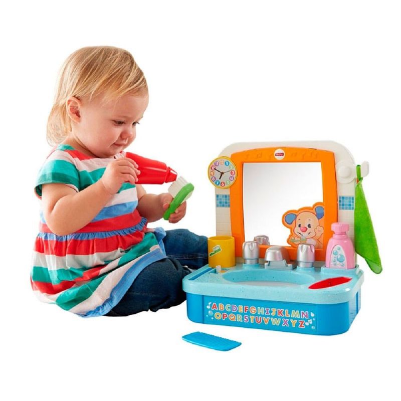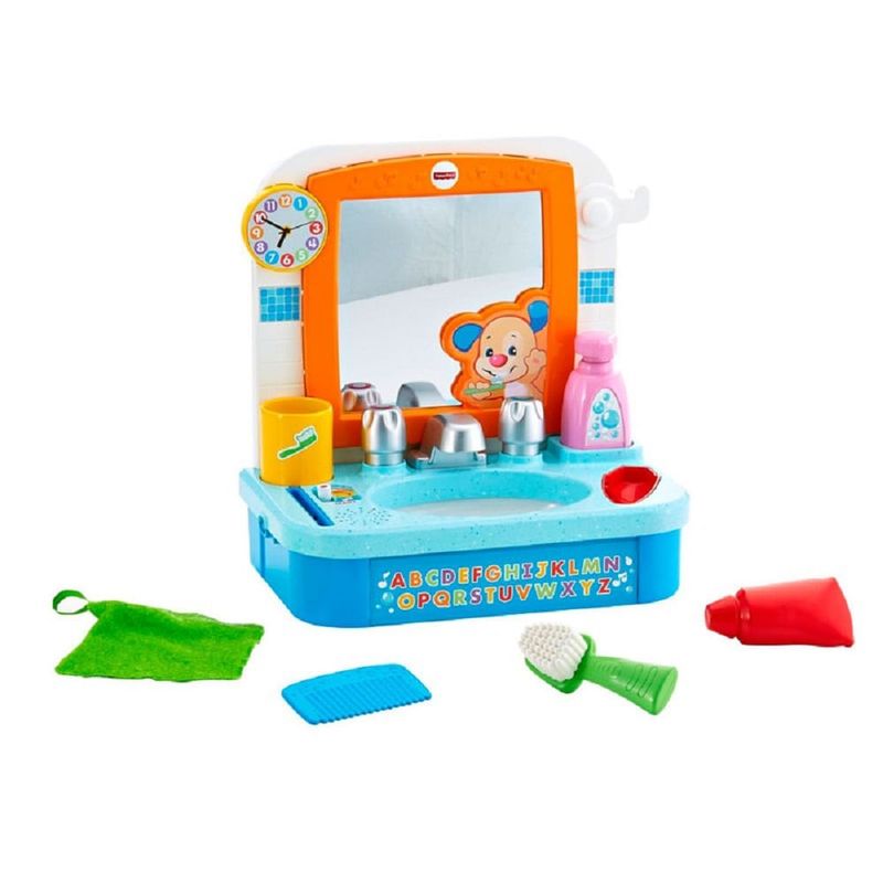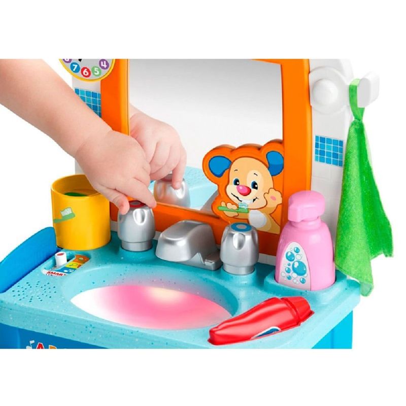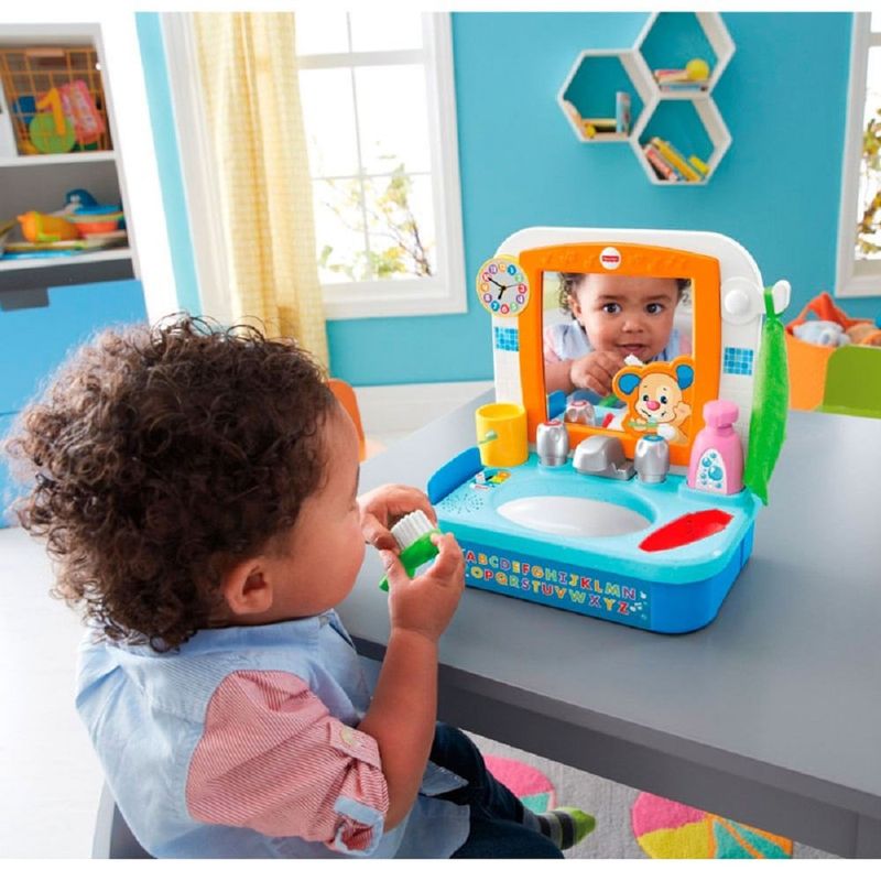vamos Nos Aprontar Para o Dia... com Uma Pia de Brinquedo Que Incentiva o Faz de Conta! Abra As Torneiras, Use o Sabonete ou Retire a Escova de Dentes, Pasta ou Pente Para Ouvir Músicas e Frases Que Ensinam Sobre Rotinas Diárias, Objetos Familiares, Cores, Letras e Muito Mais. a Pia Também Acende Quando As Crianças Abrem As Torneiras Azul e Vermelha. Crianças Curiosas Vão Adorar Dar Uma Espiada No Espelho Brilhante. e Uma Toalha Macia e Removível Dá o Toque Realista Na Diversão com Limpeza!