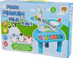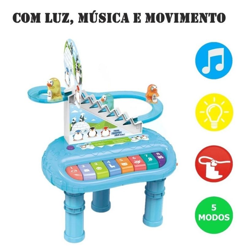 Diversão 2 em 1: Toque o piano e brinque com os pinguins que sobem a escada e descem pela rampa, oferecendo uma experiência de brincadeira dinâmica e envolvente.