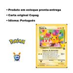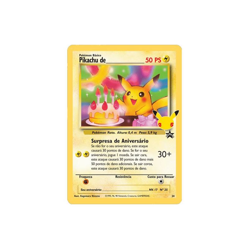 Diretamente do mundo Pokémon, o Pokémon mais querido de todos vem em um card Promo da Coleção Clássica de Celebrações para festejar seu aniversário junto com você, o Pikachu! A carta é metalizada(foil) e vem com uma linda arte do nosso companheiro Pikachu, colecione ou utilize para jogar com os amigos.