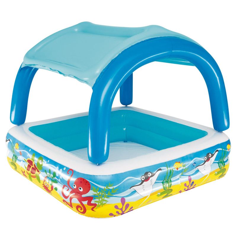 A colorida e estampada Piscina Inflável Amigos do Mar conta com uma cobertura especial para proteger os pequenos durante aqueles dias de sol intenso. Para a diversão ser garantida, é recomendada apenas para crianças acima de 2 anos de idade. Com uma altura é de 1,14m e circunferência de 1,4m, possui capacidade para até até 330L. É confeccionada em vinil resistente, possui 5 válvulas de segurança, adesivo de reparo e fundo inflável para maior conforto dos pequenos. Atenção: nunca deixe crianças sozinhas perto da água sem supervisão de um adulto!