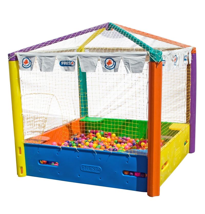 Piscina de bolinhas produzida em plástico rotomoldado em formato quadrado (2m x 2m), com uma plataforma em cada canto que funciona como um pequeno trampolim.4 tirantes plásticos coloridos para sustentação da rede ou da lona em formato de 4 águas.Montagem totalmente por encaixe, sem necessidade de utilização de nenhum parafuso.Cobertura com lona colorida ou rede.Sem bolas.DimensõesAltura: 2,35 mLargura: 2,00 mComprimento: 2,00 mGarantia