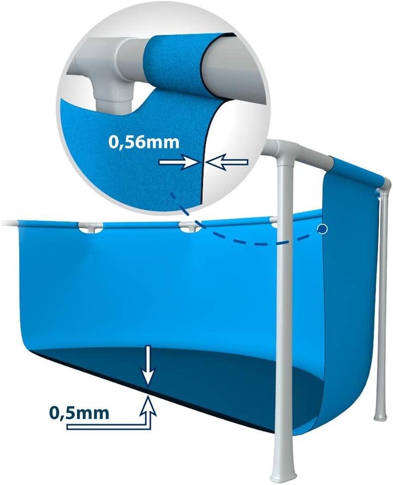 Projetada para resistência, esta piscina é suportada por estruturas de aço fortes e duráveis que são revestidas a pó para resistência à ferrugem e beleza. As paredes laterais laminadas super resistentes e triplas são reforçadas com uma faixa ao redor para manter as pernas da estrutura firmemente no lugar. Esta piscina fará do seu quintal o lugar para estar durante todo o verão, pois sua família pode relaxar e brincar.