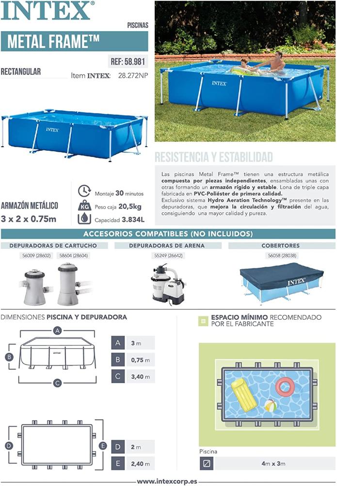 Piscina Intex Retangular de Armação de Metal de 3.834 Litros com 3,00m x 2,00m de Largura e 75cm de Profundidade