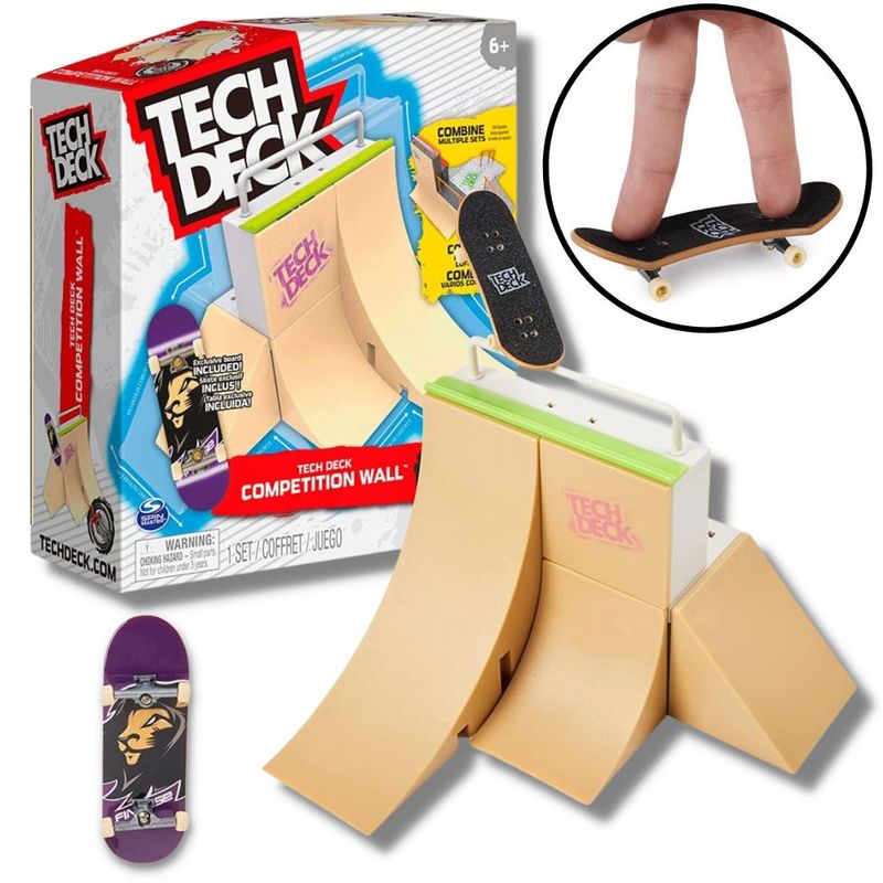 - O conjunto de rampas Competition Wall inclui tudo o que você precisa para construir um parque personalizado incrível para você aperfeiçoar suas habilidades de skate dedo. Faça suas manobras do jeito que voce quiser, pule, esculpe o canto, deslize o enfrentamento, e ainda personalize do jeito que você quiser.Os dedos tech deck e os conjuntos de rampas são para crianças e amantes de skate com idade igual ou superior a 6 anos. Se você quer gráficos de skate reais de empresas de skate de verdade, então tem que ser Tech Deck - comece pequeno, vá grande e colete todos eles!