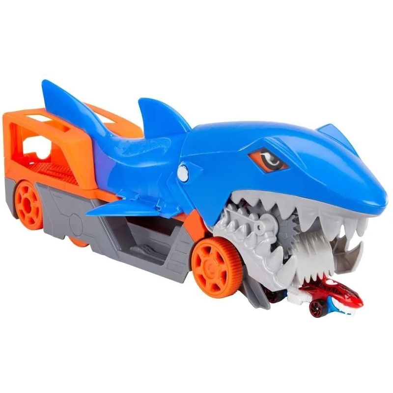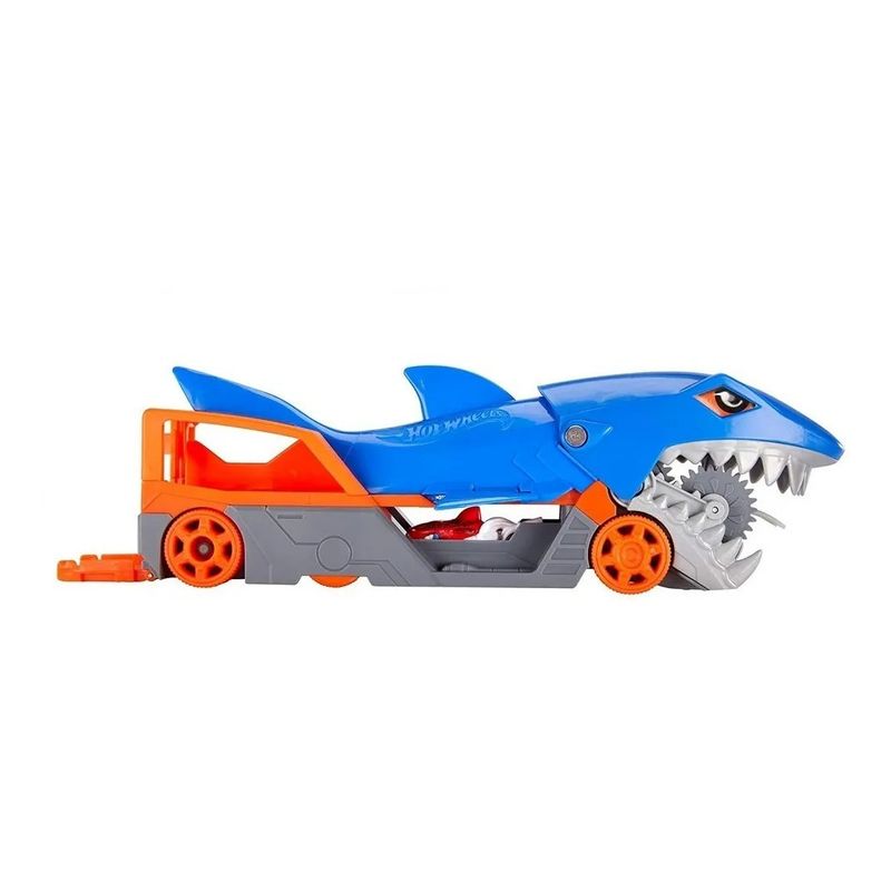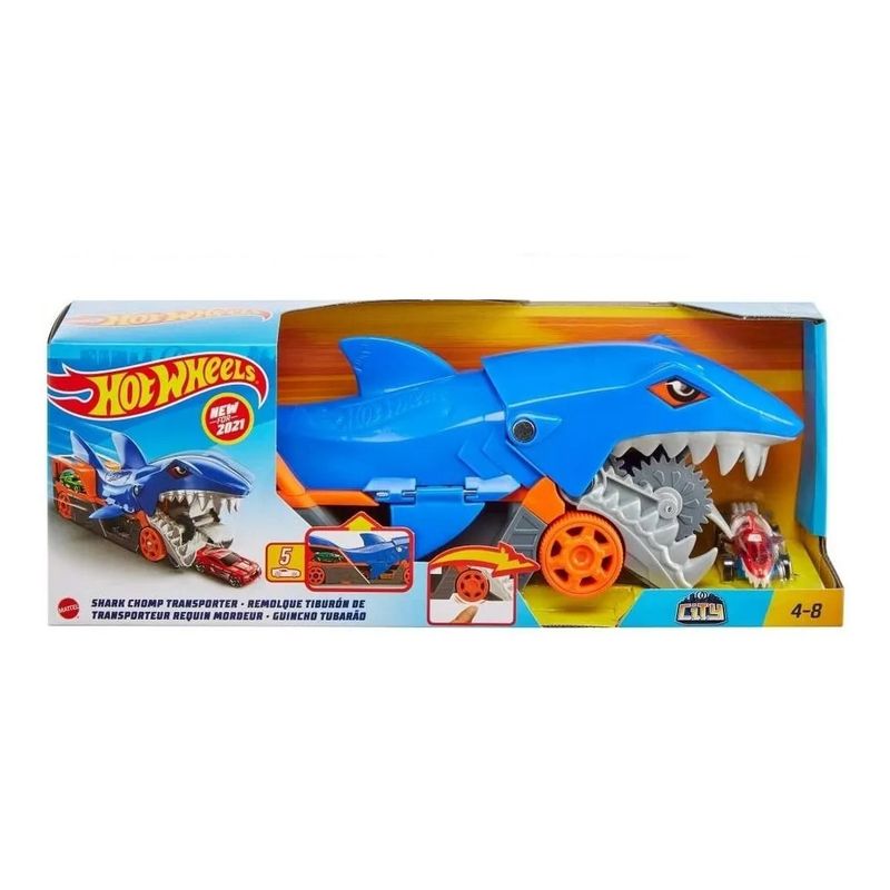 PISTA DE BRINQUEDO HOT WHEELS - GUINCHO TUBARÃO - MATTELO conjunto de Guincho Tubarão Hot Wheels recria o icônico Shark Bite Hot Wheels como um caminhão totalmente novo e incrível. Basta empurrar o caminhão para ativar um mecanismo especial de mordida que faz o tubarão agarrar os carros direto com suas poderosas mandíbulas para engoli-los e guardá-los na barriga. Na hora de descarregar, há uma rampa de saída na parte de trás para facilitar o acesso. O carro Guincho Tubarão vem com um carro Hot Wheels em escala 1:64 e comporta até mais quatro, vendidos separadamente. O playset reimagina o icônico Shark Bite como um caminhão divertido com mecanismo de mastigação especial que armazena os carros na barriga do tubarão. Crianças de quatro anos ou mais vão adorar a brincadeira. Cores e decorações podem variar. Acompanha 1 Guincho Tubarão e 1 carro Hot Wheels escala 1:64.