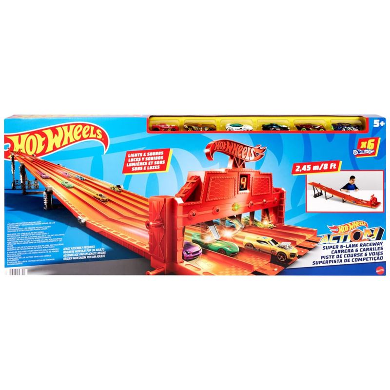 Prepare se para uma experiência emocionante com o Hot Wheels Super 6Lane Raceway Com mais de 2,43 metros de pista, as crianças podem enviar seus carros favoritos pela distância e descobrir qual é o mais rápido. O conjunto inclui seis veículos Hot Wheels para que a competição comece imediatamente. Luzes e sons realistas adicionam emoção à corrida. O conjunto é compatível com a maioria dos veículos Hot Wheels, exceto alguns modelos. As cores e decorações do conjunto podem variar. O Hot Wheels Super 6Lane Raceway é fácil de montar e desmontar, tornando o ideal para armazenamento e configuração rápida. É um presente emocionante para fãs de corridas de todas as idades.