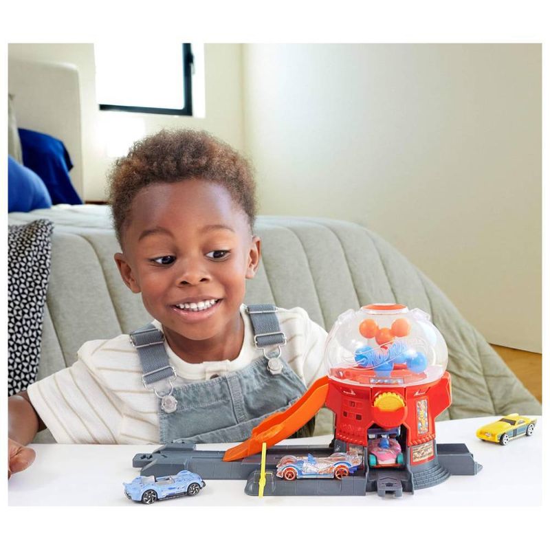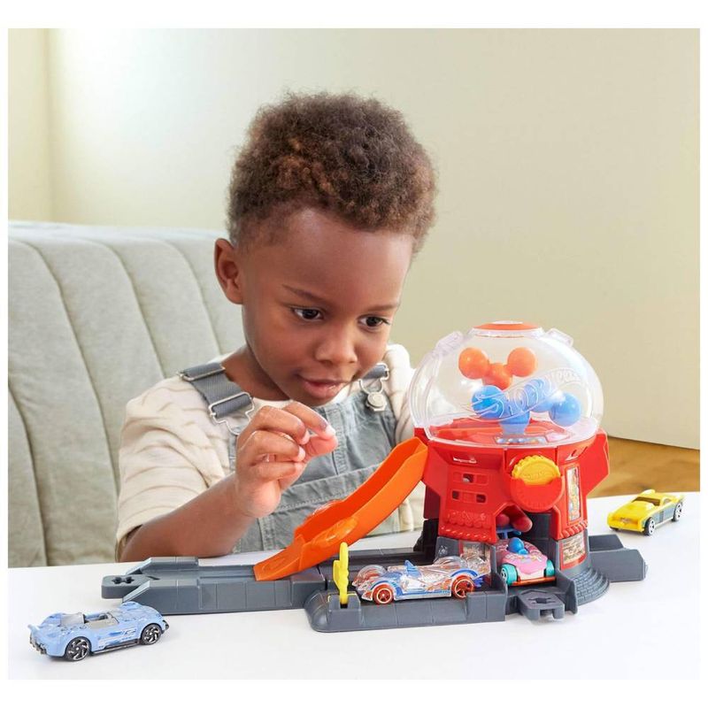 Você pode acelerar pelo lugar mais doce de Hot Wheels City com a Hot Wheels Loja de doces. Esse conjunto em forma de máquina de chicletes inspira a narrativa criativa enquanto as crianças dirigem seus carros de brinquedo pela rampa de queda gravitacional até a máquina de chicletes. Você pode pressionar o compartimento de moedas para baixo para fazer as balas de goma se moverem e lançar o carro pela rampa de saída. Na base, há um portão móvel para brincadeiras interativas e estacionamento para outros carros. O conjunto pode ser conectado a outros conjuntos e pistas Hot Wheels usando o sistema Pista Speed Snap. Um veículo está incluído; veículos, pistas e conjuntos adicionais são vendidos separadamente. As cores e as decorações podem variar.