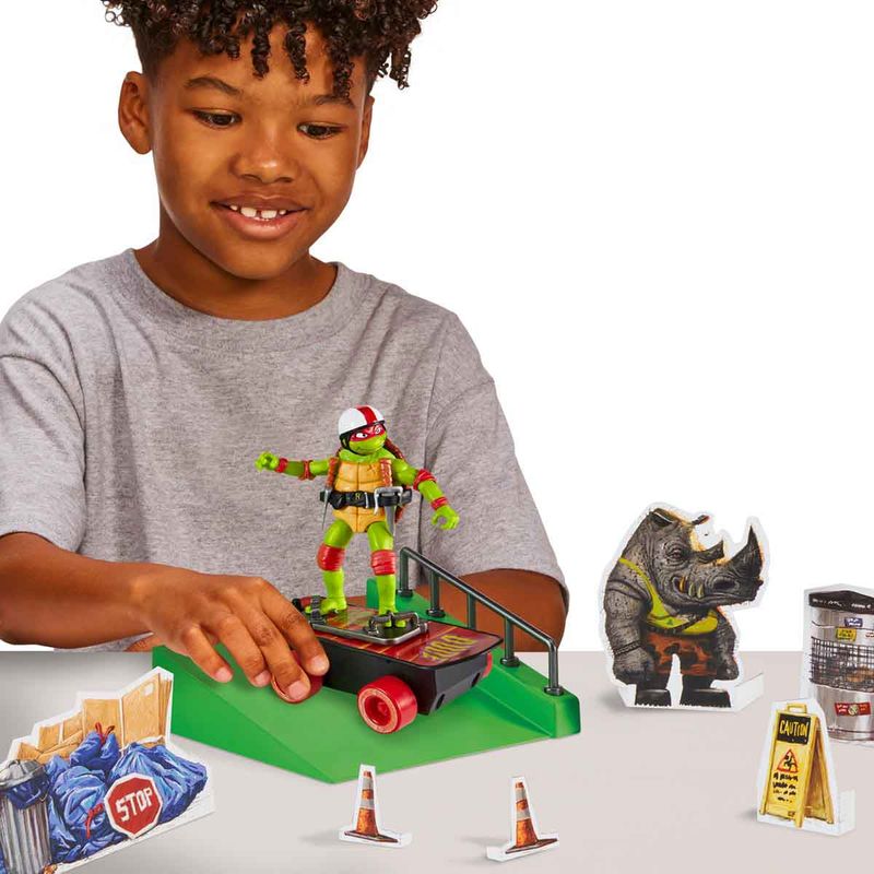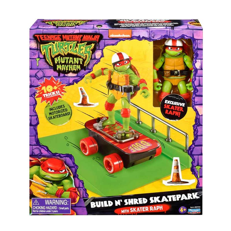 Inspirados no filme "As Tartarugas Ninja: O Caos Mutante", colecione cada um dos 4 conjuntos com boneco e pista de skate das Tartarugas Ninja. Cada boneco possui detalhes autênticos e é altamente articulado. Utilize a pista para fazer manobras incríveis e derrotar os vilões. Você pode personalizar e criar seu próprio skatepark exclusivo cortando os bonecos e acessórios inclusos no conjunto. Ao adquirir todos os 4 conjuntos "Build N' Shred Skatepark", você poderá juntar suas pistas para criar um skatepark completo (Cada um vendido separadamente).