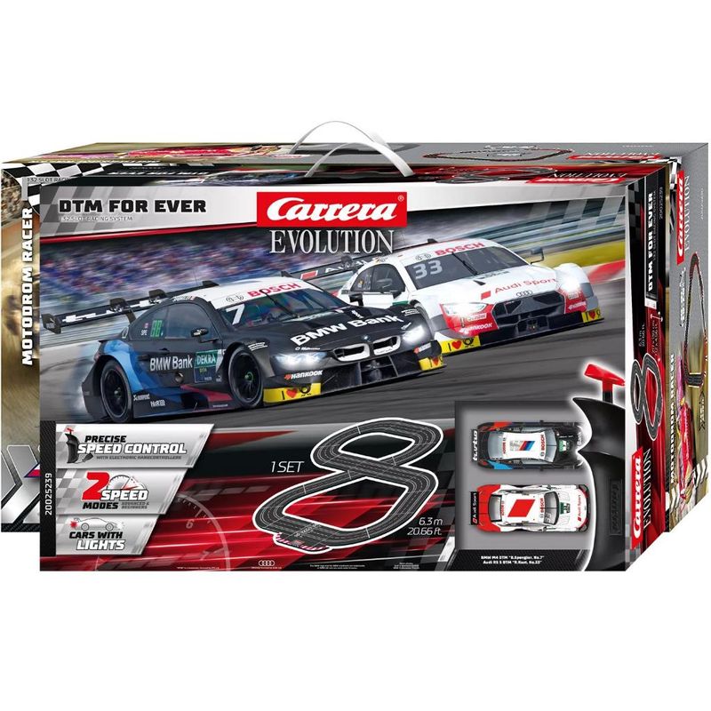 O BMW M4 DTM 'B.Spengler, No.7' preto fosco e o impressionante Audi RS 5 'R.Rast, No.33' vermelho e branco chamam a atenção em todo o circuito de corrida Carrera Evolution de 5,2 metros, que apresenta longas retas , curvas íngremes e pistas extra largas em escala 1:24. Esses carros com luzes dianteiras e traseiras estão prontos para correr enquanto você pressiona o acelerador rápido e forte no controle eletrônico! Em última análise, o nome do driver DTM vitorioso depende completamente de você!