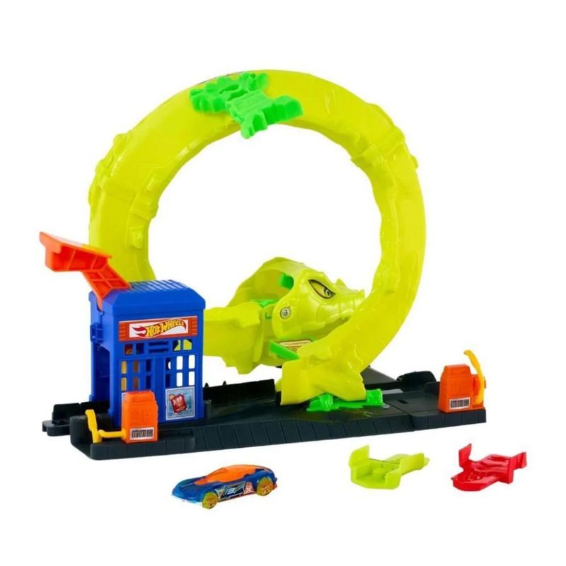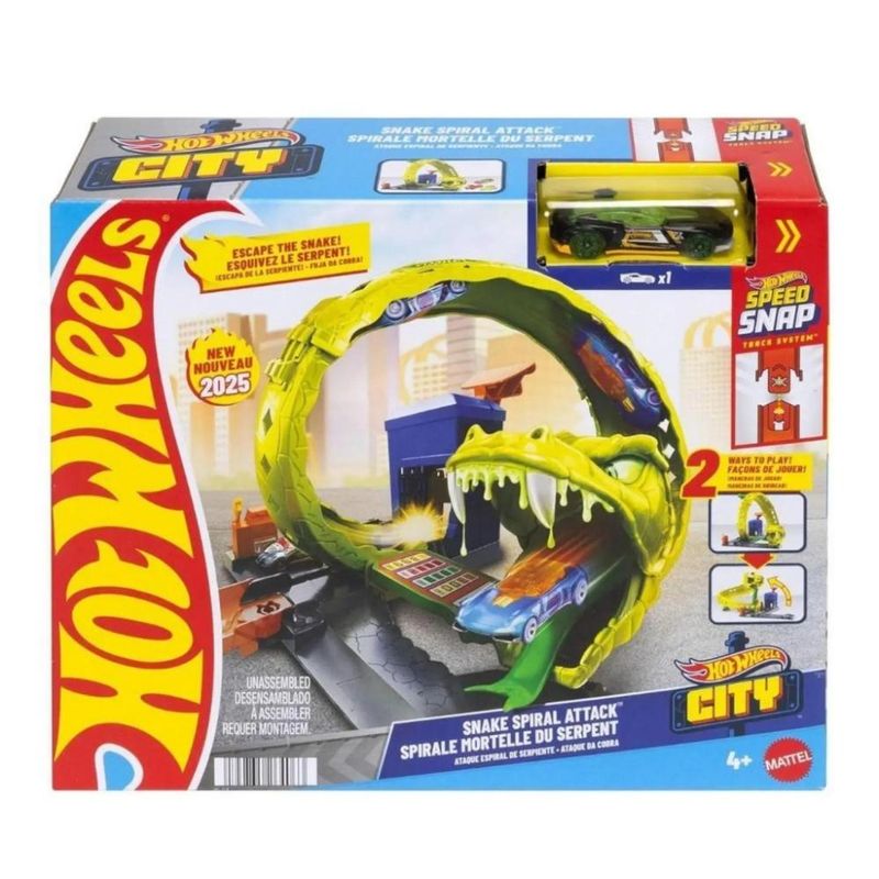 A Pista Hot Wheels City – Ataque da Cobra é um conjunto interativo que combina velocidade, acrobacias e ação com uma cobra gigante como obstáculo principal. Ideal para crianças que adoram desafios e aventuras com carrinhos.Recursos e conteúdo:Cobra articulada com mecanismo de captura e liberação de veículosMinimercado com lançador secretoPosto de gasolina com mangueiras ajustáveisLoop radical na cauda da cobra1 carrinho Hot Wheels escala 1:64 incluídoConectores compatíveis com outras pistas da linha Hot Wheels CityEstimula coordenação motora, imaginação e raciocínioIdade recomendada: A partir de 4 anos\n\nIdade recomendada:2-4 anos;Composição/Material:Plástico;Funciona com pilhas:Não;Brinquedo com luz:Não;Brinquedo com som:Não;Dimensões:30,7x26x10 cm;Peso:31 kg;Código de Barras:9007361900001;Garantia do Fornecedor:3 Meses contra defeito de fabricação;