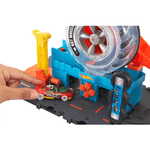 As crianças enfrentam várias voltas e reviravoltas na Hot Wheels City Super Twist Tire Shop enquanto giram a chave central e movem seus carros pelas rodas translúcidas da loja. Quando chegam ao topo, eles descem a rampa para novas aventuras. A base do playset se conecta a outros conjuntos Hot Wheels e pode ser usada com peças de pista Hot Wheels adicionais para que as crianças possam construir um mundo de acrobacias e corridas de seu próprio design (conjuntos e pistas adicionais vendidos separadamente). Um carro Hot Wheels está incluído, mas até quatro podem girar pela estrutura do pneu de uma só vez (carros adicionais vendidos separadamente).