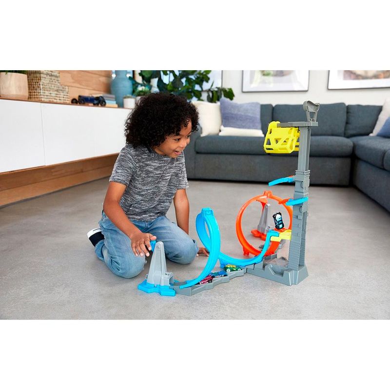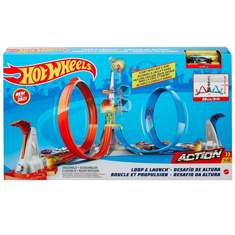 A Pista Hot Wheels Loop Launch Desafio da Altura GRW39 Mattel leva a competição a outro patamar! Os veículos aceleram por um loop em espiral e são lançados na direção da gaiola que se fecha quando um carro chega até ela. A gaiola é ajustável e pode ser levantada ou abaixada dependendo do nível de competição desejado. Uma série de plataformas com diferentes pontuações ao longo do trajeto garante ainda mais emoção ao desafio.