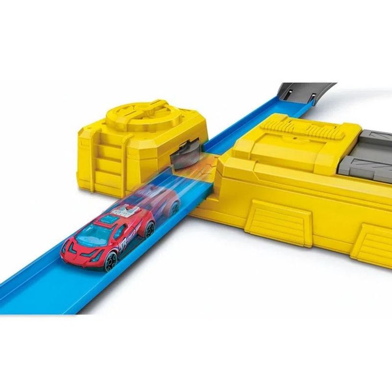 Acompanha 1 pista de 3,2 metros, 1 guindaste, 1 lançador de rochas, 2 mini veículos die-cast “Spectro” e “Justiceiro” com desgin de carros de corrida, 1 pista com looping e um 1 lançador motorizado!