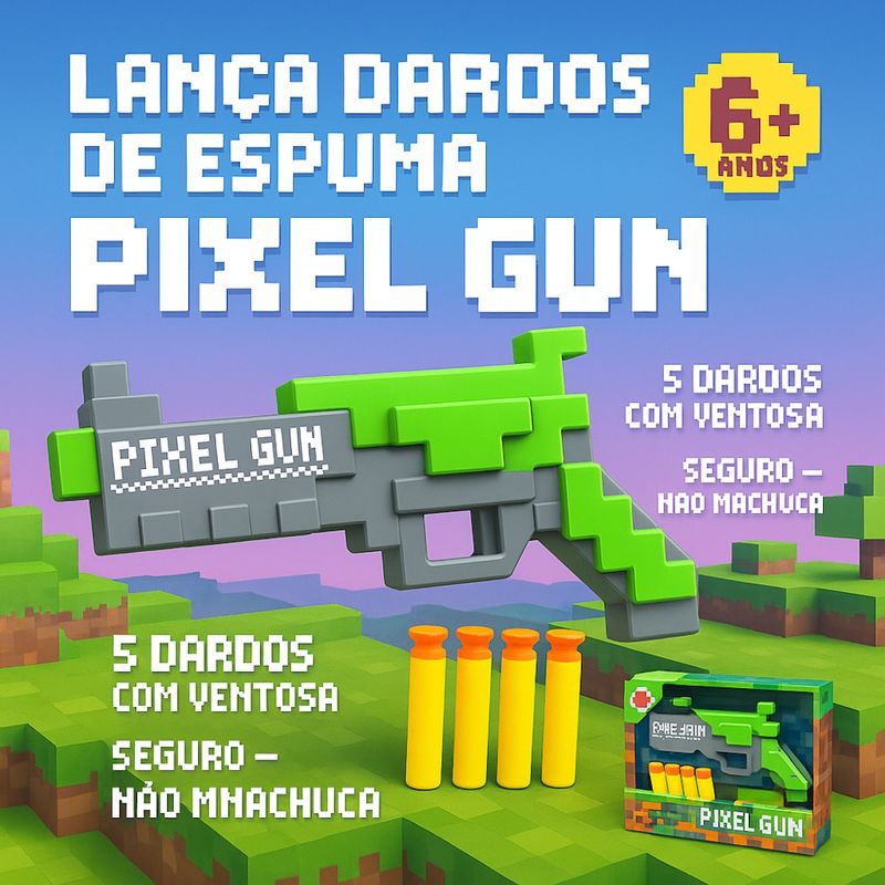 Divirta as crianças com o Lança Dardos Pixel Gun, inspirado no universo pixelado que elas amam. Cada lançador vem com 5 dardos de espuma com ventosa, macios e seguros. Modo de uso: puxe para trás para engatilhar, coloque o dardo, mire e dispare. Ideal para quintal, parque e festas, estimula coordenação motora, mira e imaginação em aventuras no “mundo dos pixels”.