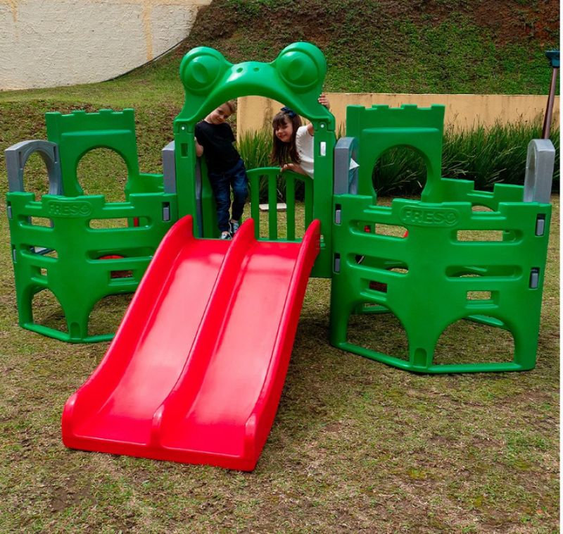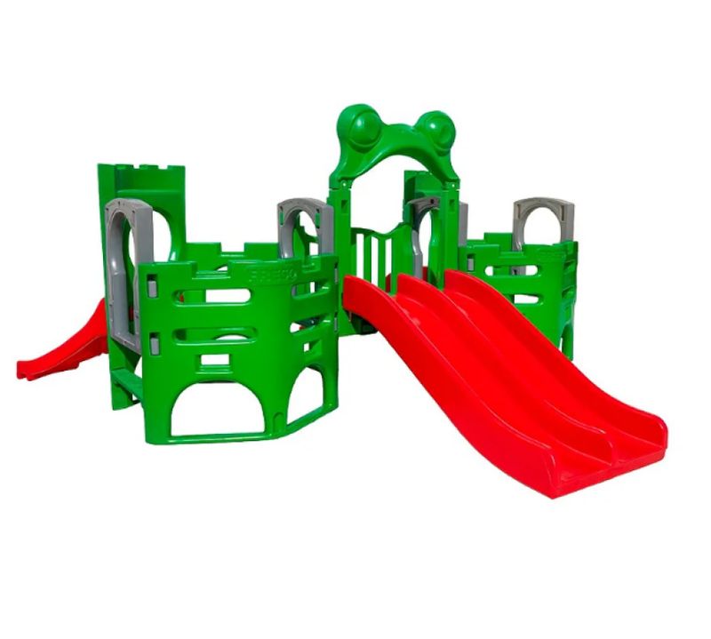 Principais Benefícios do Playground Adventure Frog:Escorregador duplo;?Formato lúdico;?Ponte que liga um módulo ao outro;?Não racha nem desbota mesmo exposto ao tempo;?Telhados para proteção das crianças;?Polietileno pigmentado com aditivo UV Composição do Playground Adventure Frog Polietileno de média densidade (material não tóxico e reciclável). ?Polietileno pigmentado (colorido), com aditivo UV que garante a coloração original mesmo que exposto ao tempo.?O Playground Adventure Frog Contém:2 Bases Principais;?2 Escorregador rampa reta;1 Escorregador duplo;?1 Arco em formato de sapinho;?8 tubos metálicos de sustentação (4 em cada módulo);?1 Ponte de transição.