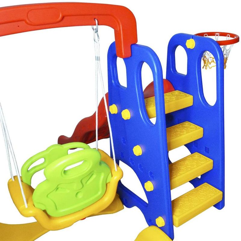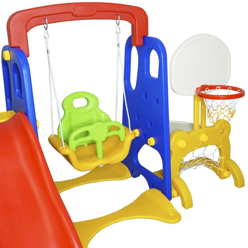 Um só playground com cinco atrações que podem ser usadas simultaneamente ou separadamente, escorregador, balança com assento anatômico com barra de proteção, cesta de basquete, tabela de basquete e gol, que tornam este playground ao mesmo tempo completo e compacto. É diversão garantida!