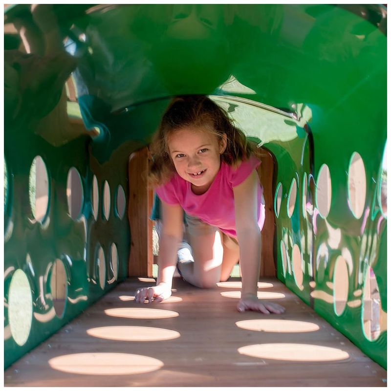 Diversão em cada nível: As várias opções de acesso, como a escada de pedra, o escorregador de ondas de 3 metros e o túnel elevado, garantem rotas de entrada e saída emocionantes. Depois de tanta brincadeira, a banca embutida, os dois balanços de cinto e o trapézio oferecem um lugar para relaxar e se recuperar.