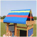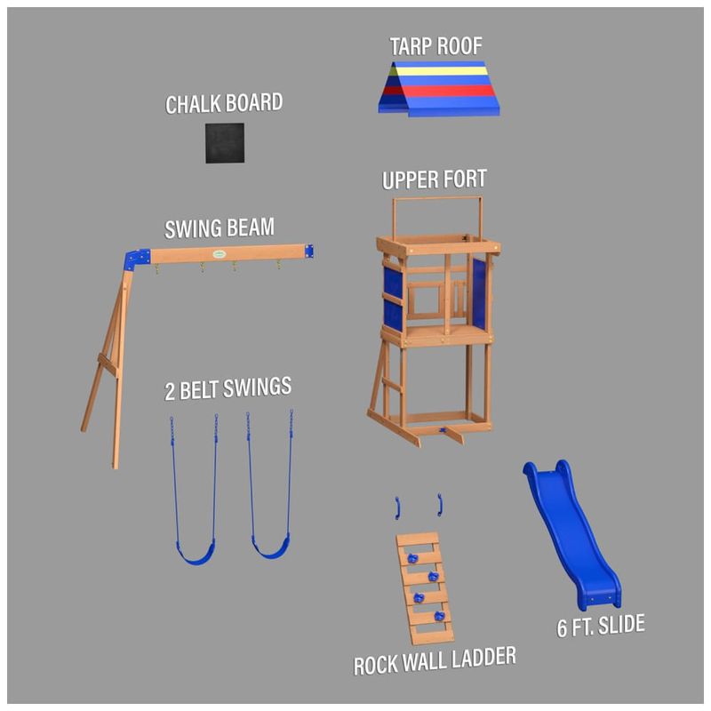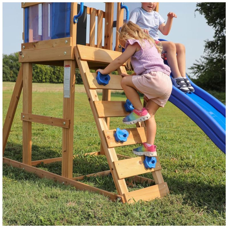 O deck coberto de 1,22 metros (4 pés) do Bay Pointe vem com um dossel colorido e painéis de proteção de malha, criando um ótimo espaço para uma pausa e para brincar à sombra. O deck é também o local perfeito para trabalhar a coordenação olho-mão-pé na escada de parede de pedra, que desafia os pequenos a escalar com segurança enquanto se divertem.