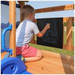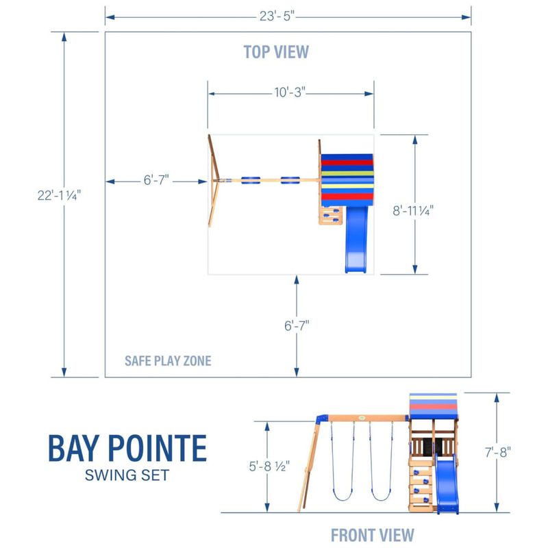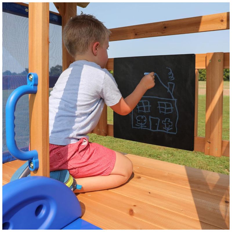 Desenvolvido especialmente para crianças menores, o Bay Pointe inclui um quadro-negro para brincadeiras criativas e correntes de corda nos balanços, garantindo segurança extra e evitando que os dedinhos se machuquem durante a diversão.