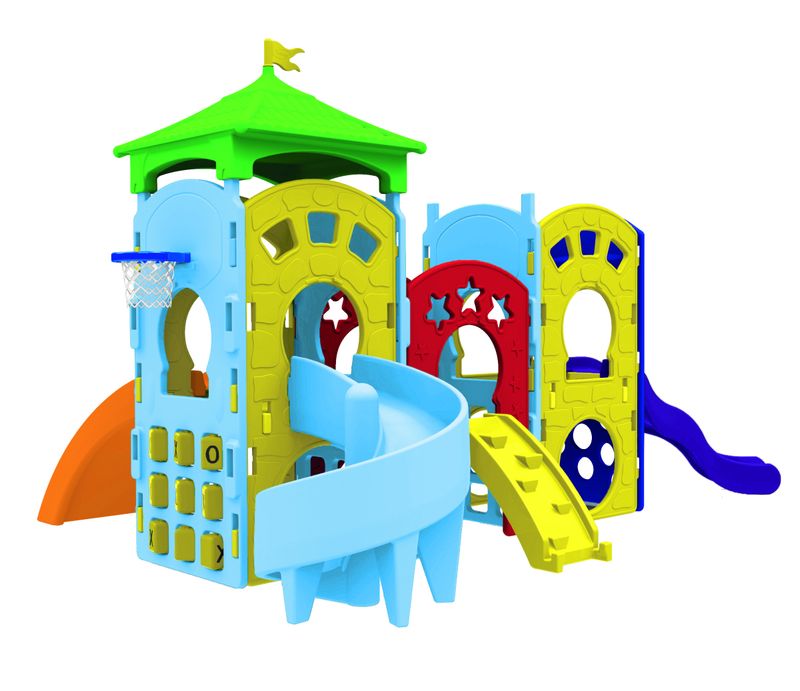 Módulos com nível superior e inferior em formato quadrado, composta por 10 paredes: 4 paredes grandes azuis, 4 paredes grandes amarelas, 2 paredes médias vermelhas, 1 telhado, 1 escorregador em curva, 1 escorregadores em onda, 1 escorregador pequeno que vira escalador, 1 escalador, 9 cubos do jogo da velha e 1 tabela de basquete com bola. Cobertura com telhado quadrado. Aberturas nas paredes em formato circular para instalação de componentes como escorregadores, escaladas, etc. Playground Modular com possibilidade de expansão ilimitada, podendo ser acoplado a qualquer produto da linha de playgrounds XALINGO. Ideal para locais abertos. A montagem da lateral é feita por encaixe. Produto com certificação INMETRO.