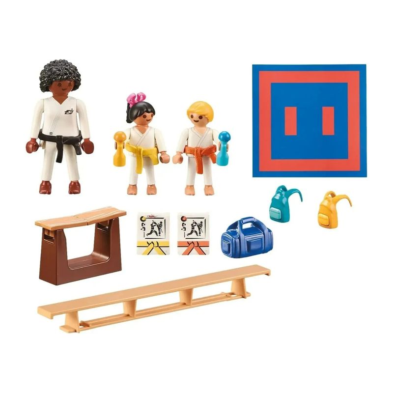 - Incluido neste conjunto colorido da Playmobil estao um instrutor de karate, dois alunos, placa de perfuracao, garrafas para beber e outros otimos acessorios.