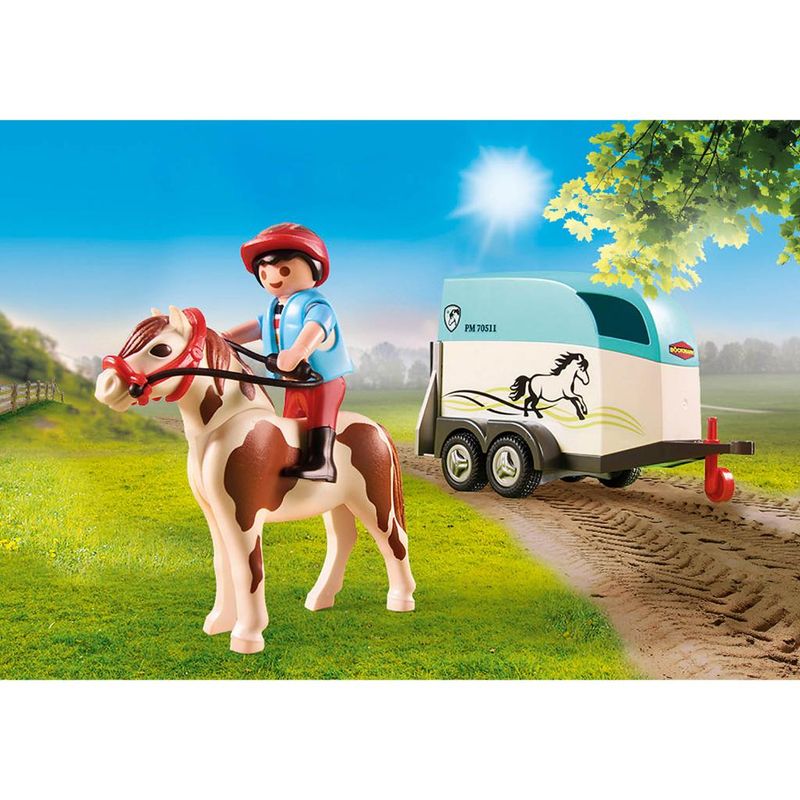 Veículo e reboque cada um com um teto removível. Dois pôneis podem ser transportados no trailer. Se um dos pôneis tiver que ir ao veterinário, ele pode ser transportado com o espaçoso trailer de pônei. O garotinho acompanha cuidadosamente seu pônei pela rampa até o trailer. Não é tão fácil, mas juntos os dois conseguem. Se o pônei estiver no trailer, a rampa é dobrada e o trailer é acoplado ao carro. O motorista sai com cuidado, o pônei não deve se assustar. O play set contém um carro com trailer de pônei, duas figuras PLAYMOBIL, um pônei e outros extras. O teto do carro e o trailer podem ser removidos.