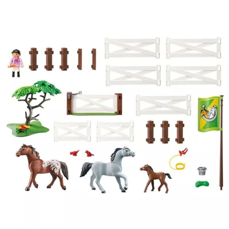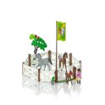 O Cercado com Cavalos é uma área fechada e mantém os cavalos seguros enquanto eles esticam as pernas e desfrutam de algum tempo lá fora. Pronto para treinar, simplesmente destrave o portão para entrar no cercado e praticar truques com os cavalos. No final do dia, recompense-os por um trabalho bem feito com uma cenoura. O conjunto inclui 1 figura Playmobil infantil, 2 cavalos, 1 potro, 1 balde de alimentação, cercas, árvores com pássaros e outros acessórios.