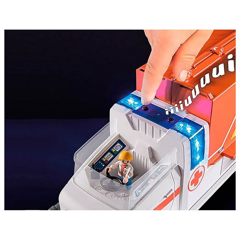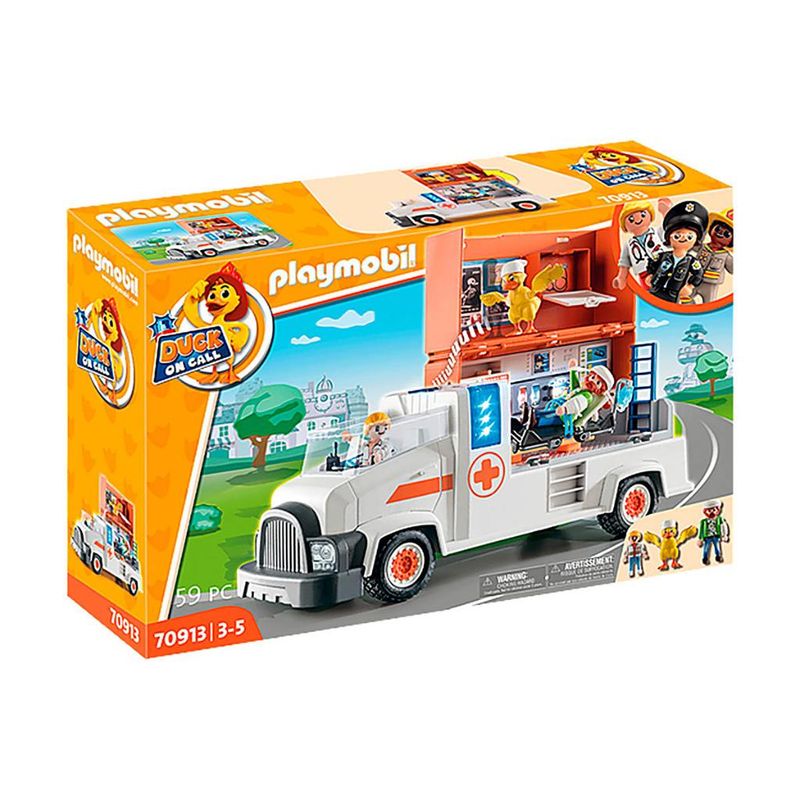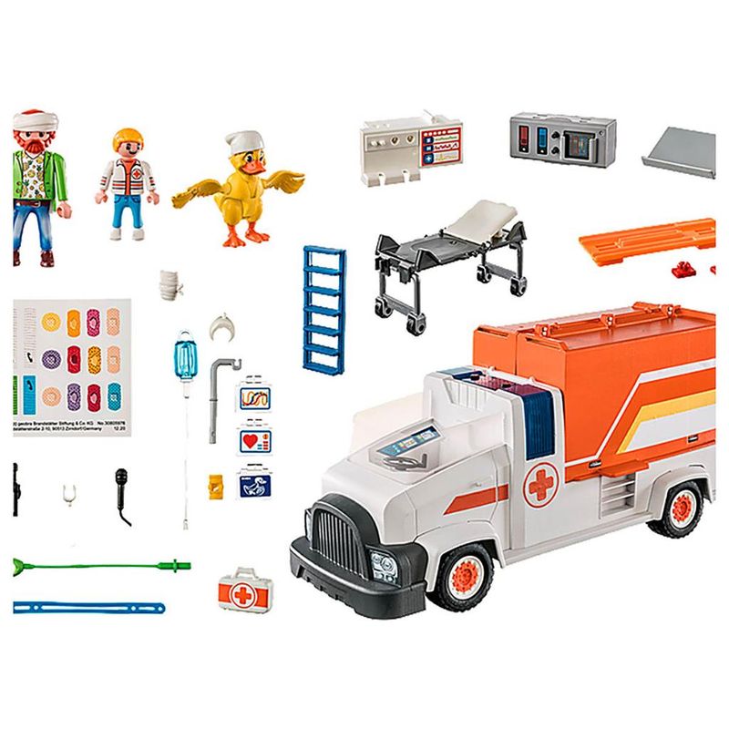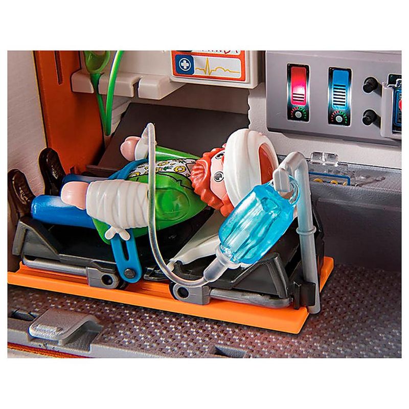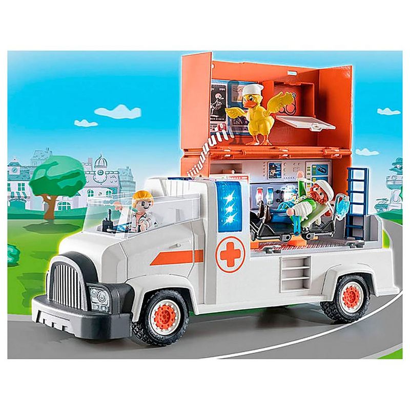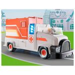 Mikey Medic e Ducklas estão atendendo ao pedido de ajuda.Luzes e sirenes em funcionamento alertam a comunidade que a ambulância está a caminho.O posto médico desdobrável permite fornecer um espaço seguro para tratar os feridos.O paciente pode ser colocado na maca e transportado para o hospital para um exame mais aprofundado.O sistema de direção basculante permite que o veículo manobre suavemente para chegar rapidamente à emergência.