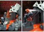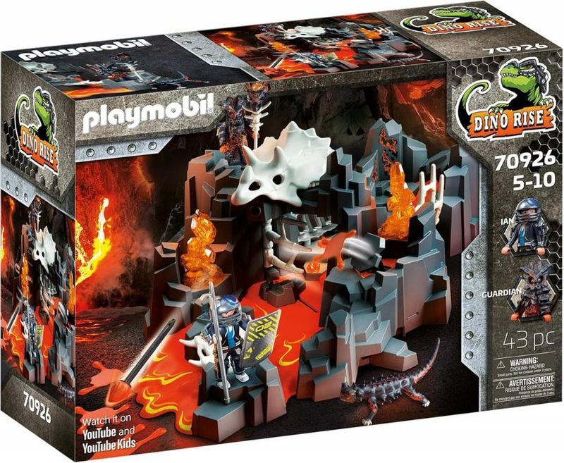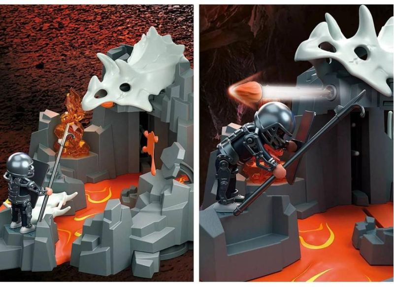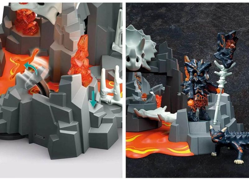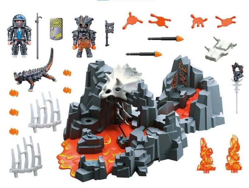 Além do perigo da lava ardente, Ian deve primeiro evitar as inúmeras armadilhas. Se o crânio do dinossauro se inclina para trás, uma chama se apaga. A fonte de lava pode ser personalizada com a lava de silicone. O conjunto inclui Ian, membro da equipe Dino Rise e o guardião da energia, bem como uma mina de lava com armadilhas secretas, escudo, gancho, machado de pedra, respingos de lava e outros acessórios.