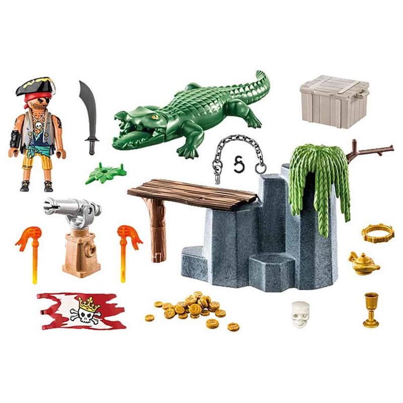 Durante a sua caça ao tesouro, um pirata encontra um crocodilo que se aproxima do cobiçado cofre do tesouro. Inclui uma caveira que brilha no escuro. Entre na caça ao tesouro com o pirata, mas tem cuidado: um crocodilo aproxima-se do precioso cofre ou está mais interessado no pirata? Os fantásticos Starter Packs da PLAYMOBIL convidam as crianças a mergulhar diretamente no variado mundo da PLAYMOBIL. Os sets incluem figuras e acessórios dos mundos populares da PLAYMOBIL, montam-se rapidamente e ficam imediatamente prontos para brincar. Além disso, este set é composto por mais de 80% de materiais sustentáveis.