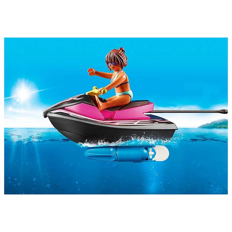 Embarca nos passeios aquáticos selvagens com a moto de água e barco banana da PLAYMOBIL. A menina senta-se animadamente no barco banana e a mulher na moto de água que a leva através das ondas. Graças ao colete salva-vidas, a menina fica bem protegida caso caia na água. Este Starter Pack Moto de Água com Barco Banana é uma ótima introdução ao mundo lúdico e divertido da PLAYMOBIL, onde meninos e meninas podem reviver as suas memórias de férias favoritas.