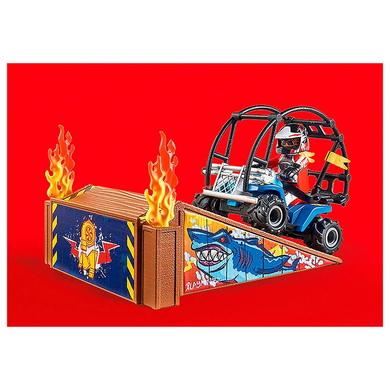 Pura adrenalina com a PLAYMOBIL! Este piloto de acrobacias tem combustível no sangue. Corajosamente ele conduz o seu quad em direção à rampa em chamas. Os espectadores prendem a respiração. O quad sai da rampa, capota e pousa de novo em segurança sobre os pneus. O motorista cumprimenta a plateia desde o veículo. Os espectadores aplaudem com entusiasmo. O quad tem um motor de fricção.